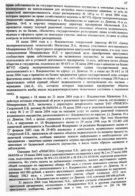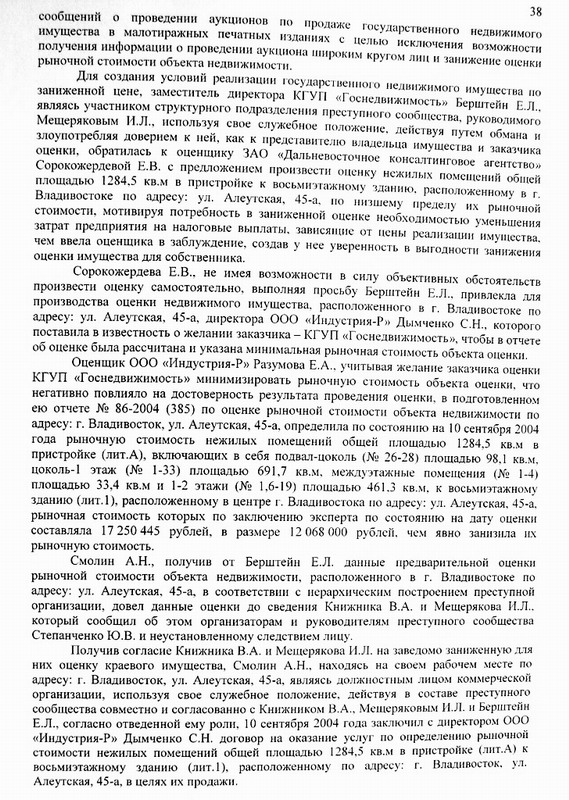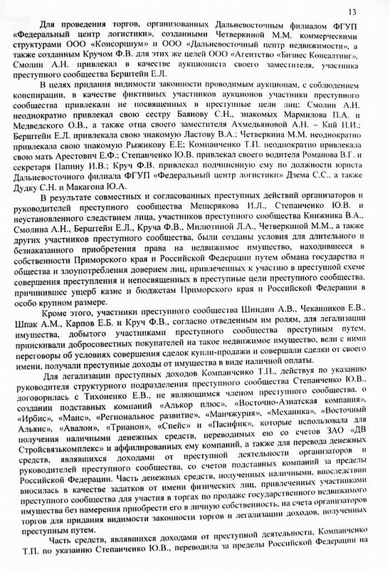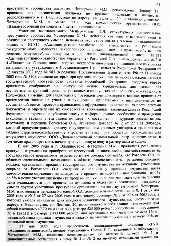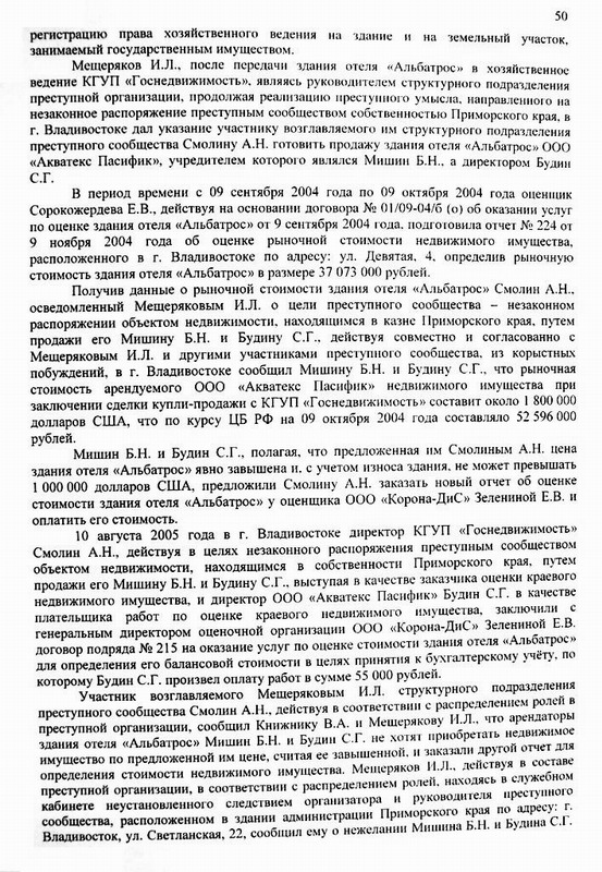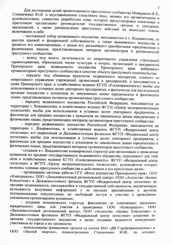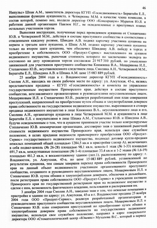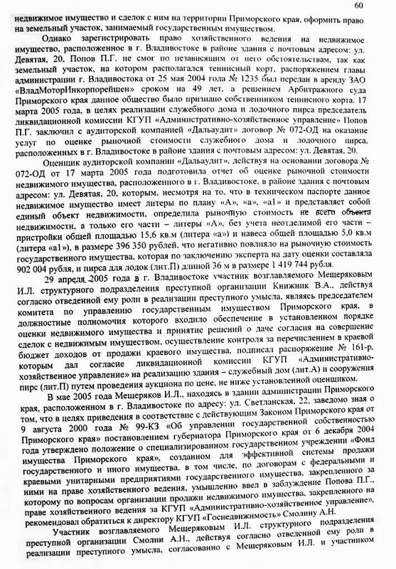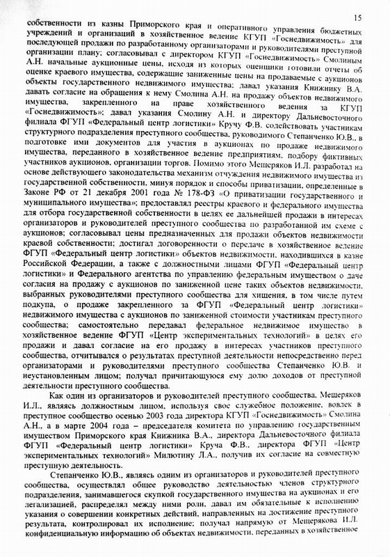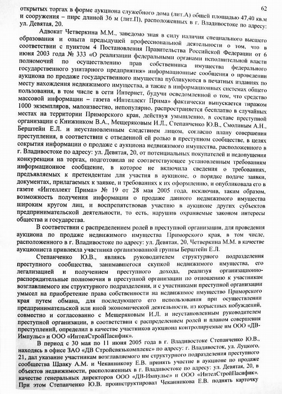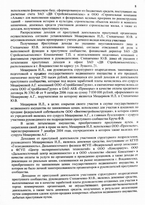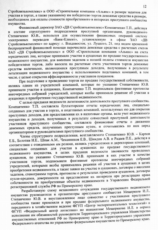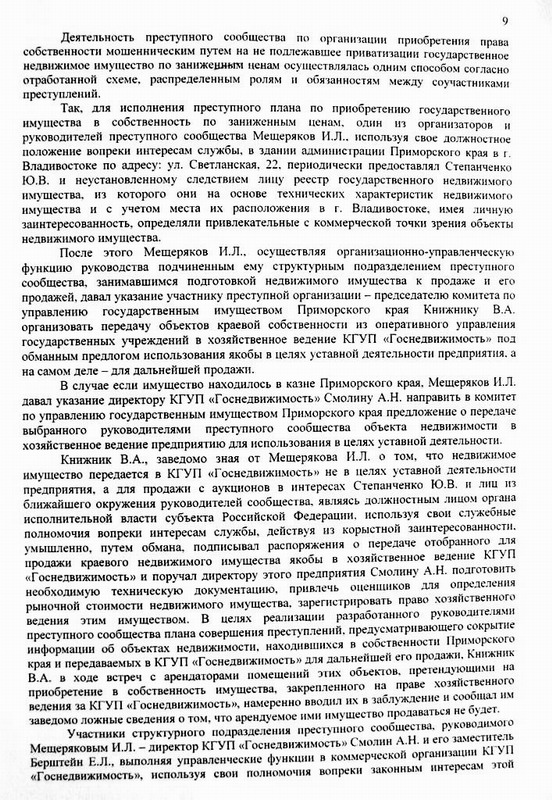 Вот общая суть дела: «В период с 2003 года по январь 2007 года участники преступного сообщества совершили 38 тяжких преступлений, в результате которых приобрели путем обмана и злоупотребления доверием, по умышленно заниженной цене объекты недвижимого имущества, находящиеся в собственности Приморского края, и объекты недвижимого имущества, находящиеся в собственности Российской Федерации (следует полный список объектов – на три листа), и причинен материальный ущерб Приморскому краю на сумму 227 934 967 рублей, Российской Федерации – 354 639 618 рублей, а всего на сумму 582 574 585 рублей, что является особо крупным размером».