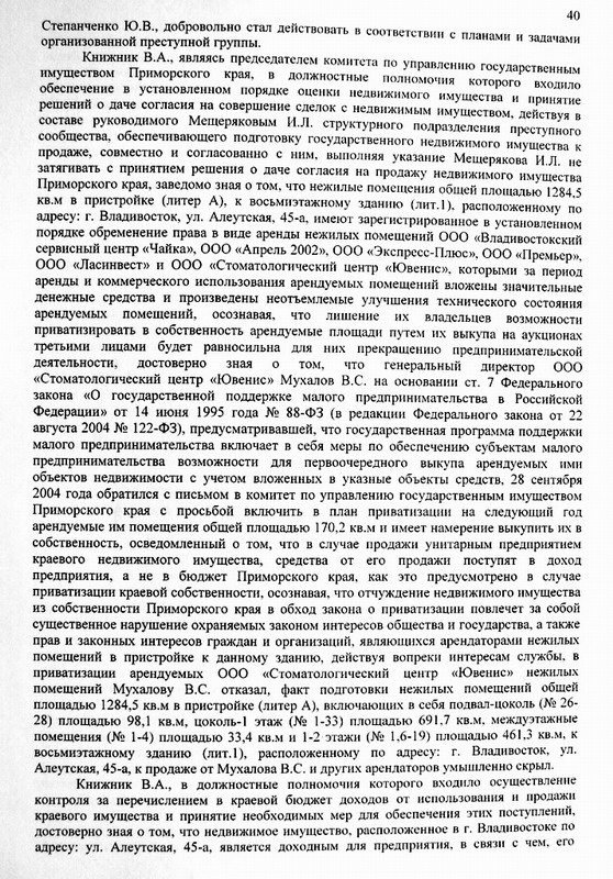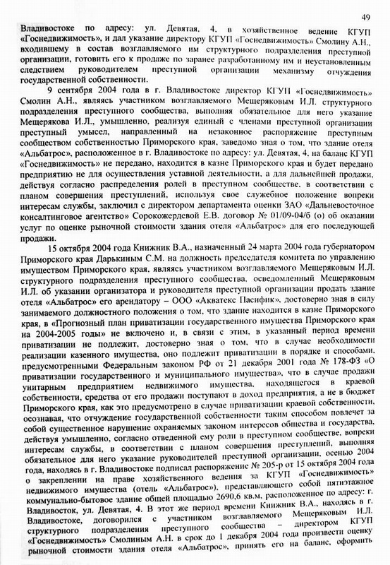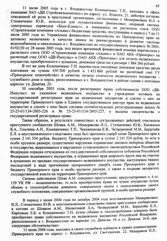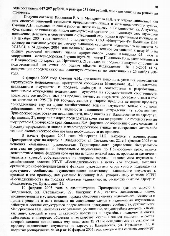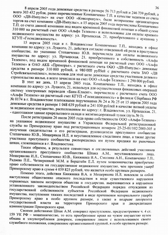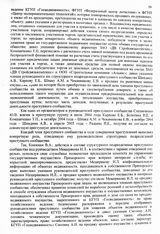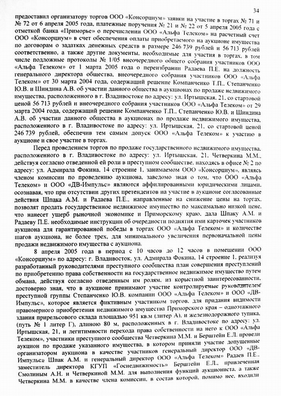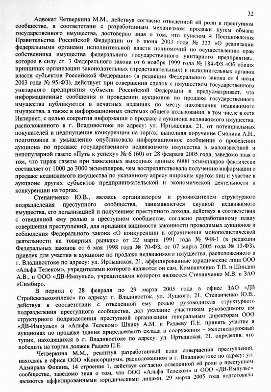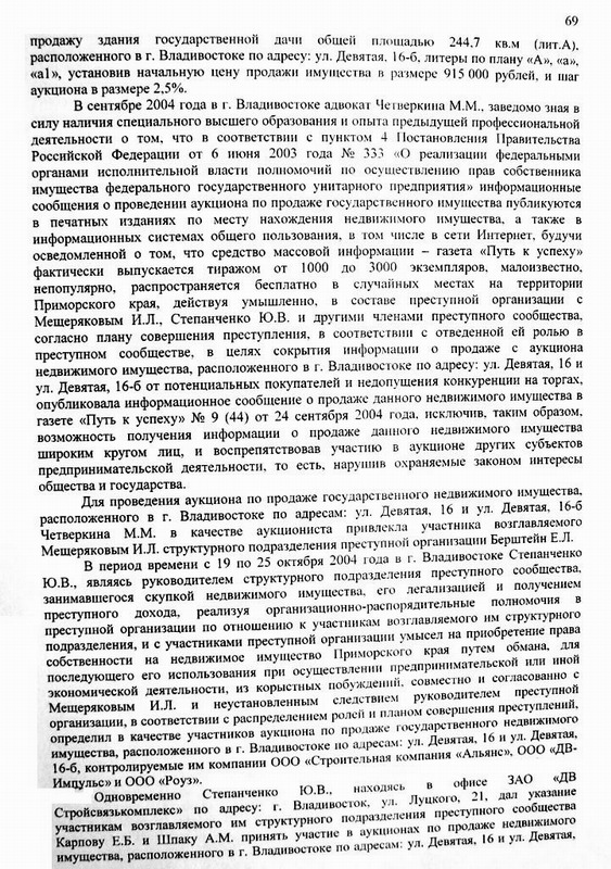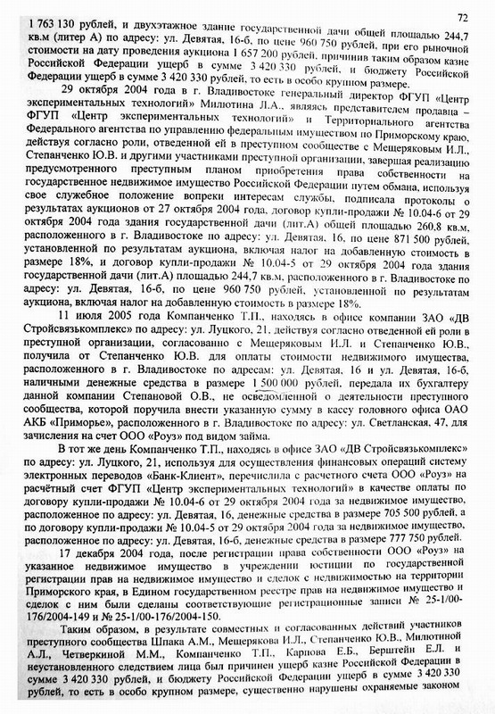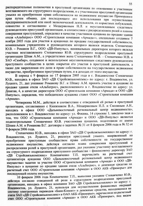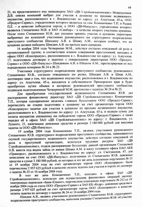 Вот общая суть дела: «В период с 2003 года по январь 2007 года участники преступного сообщества совершили 38 тяжких преступлений, в результате которых приобрели путем обмана и злоупотребления доверием, по умышленно заниженной цене объекты недвижимого имущества, находящиеся в собственности Приморского края, и объекты недвижимого имущества, находящиеся в собственности Российской Федерации (следует полный список объектов – на три листа), и причинен материальный ущерб Приморскому краю на сумму 227 934 967 рублей, Российской Федерации – 354 639 618 рублей, а всего на сумму 582 574 585 рублей, что является особо крупным размером».