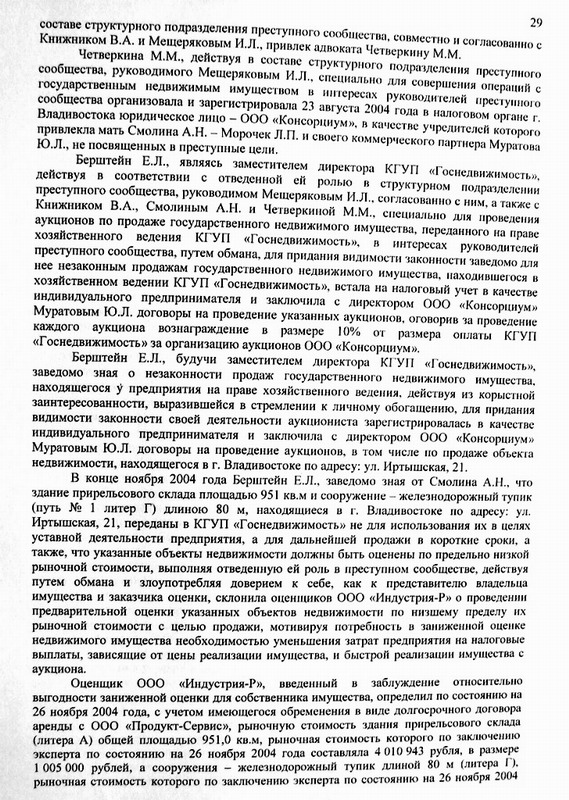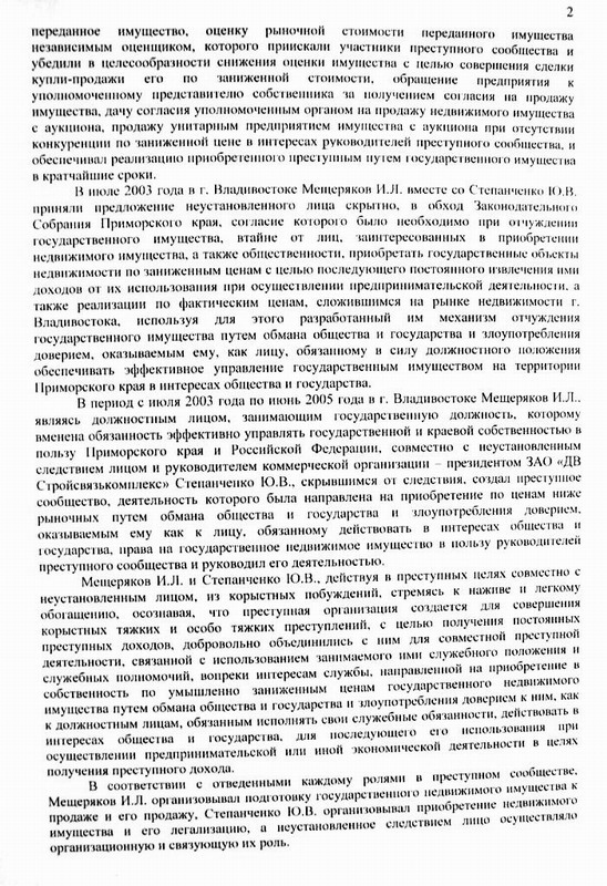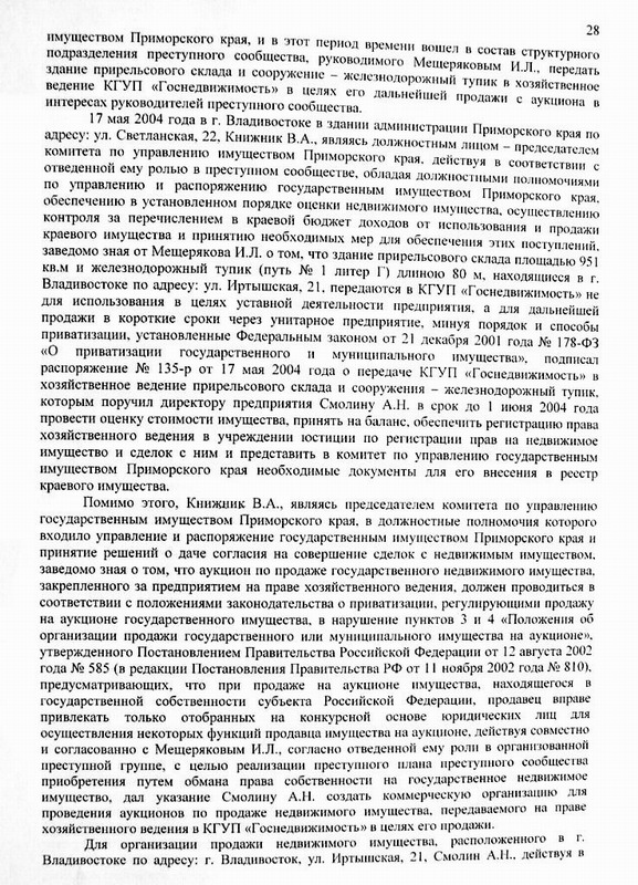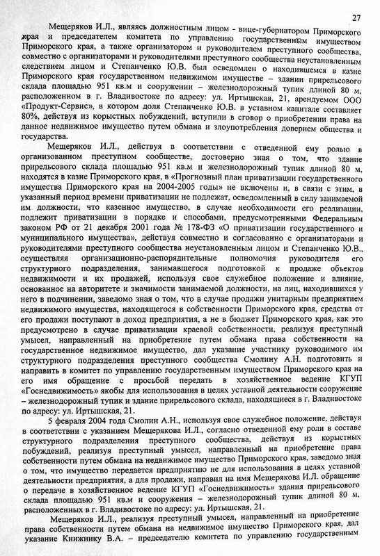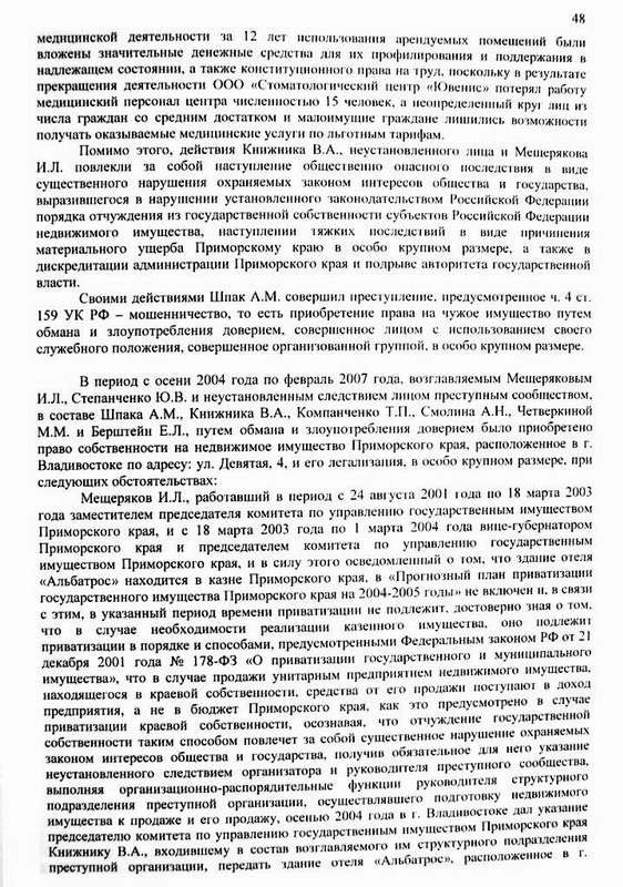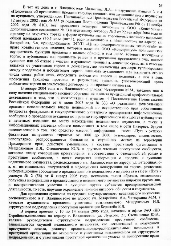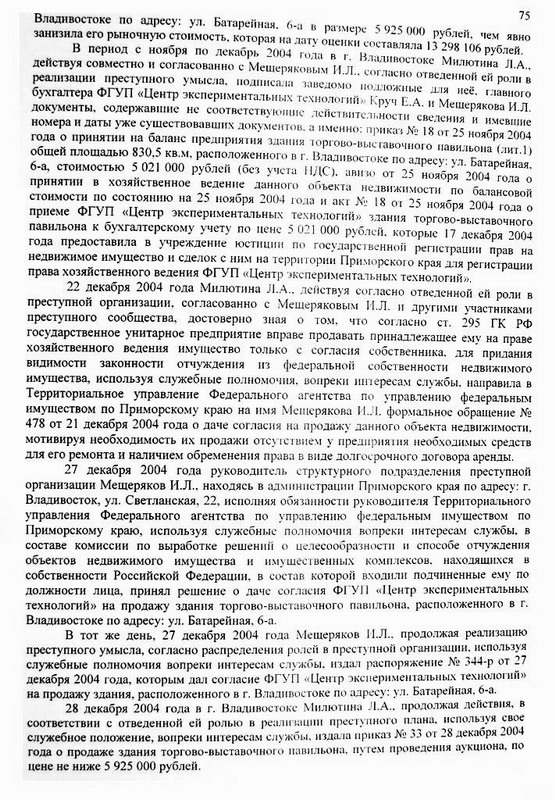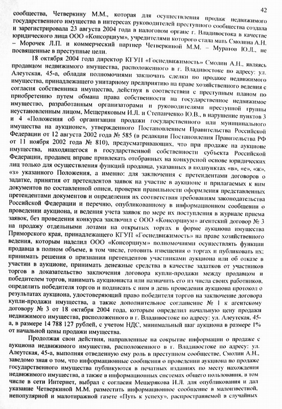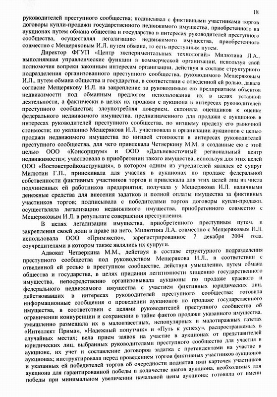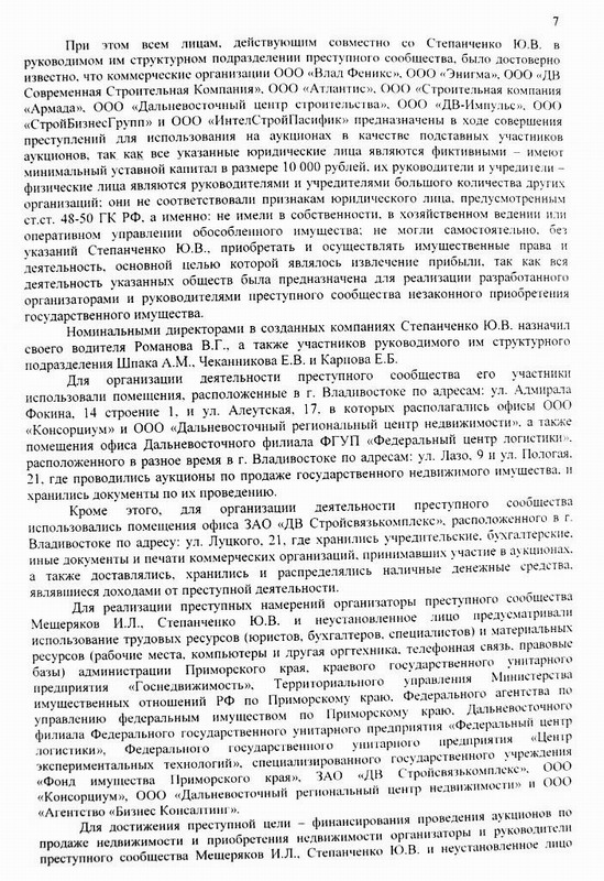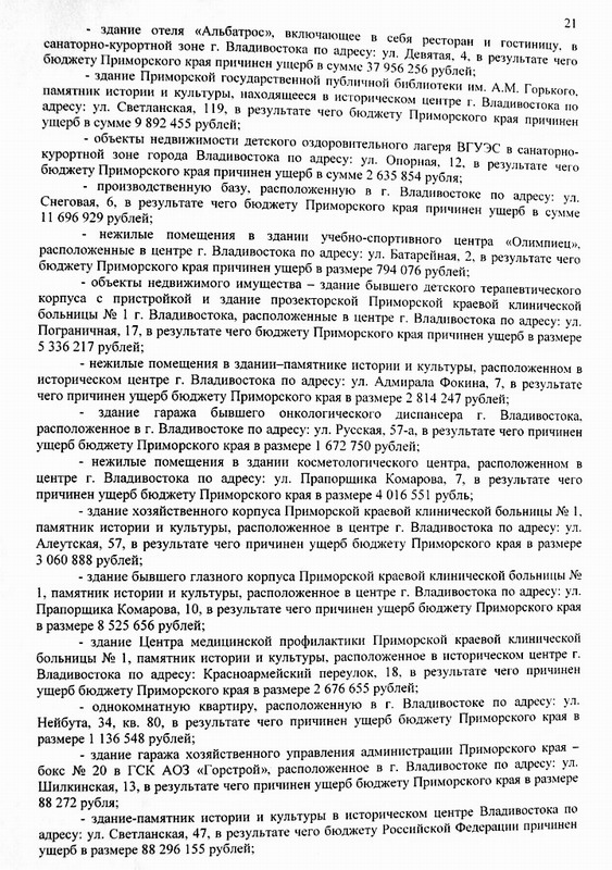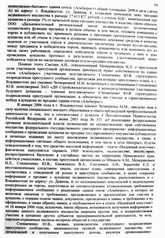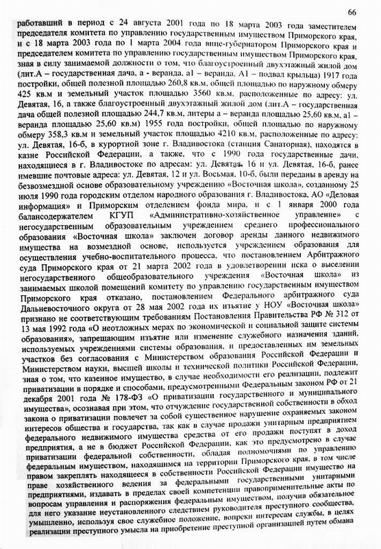 Вот общая суть дела: «В период с 2003 года по январь 2007 года участники преступного сообщества совершили 38 тяжких преступлений, в результате которых приобрели путем обмана и злоупотребления доверием, по умышленно заниженной цене объекты недвижимого имущества, находящиеся в собственности Приморского края, и объекты недвижимого имущества, находящиеся в собственности Российской Федерации (следует полный список объектов – на три листа), и причинен материальный ущерб Приморскому краю на сумму 227 934 967 рублей, Российской Федерации – 354 639 618 рублей, а всего на сумму 582 574 585 рублей, что является особо крупным размером».