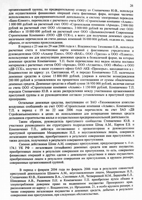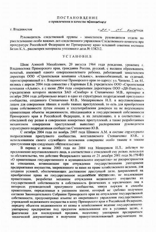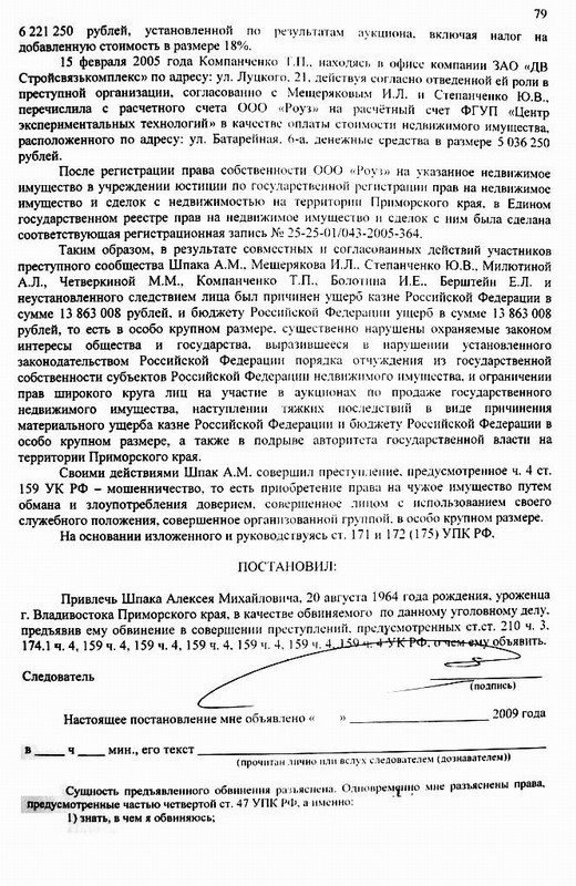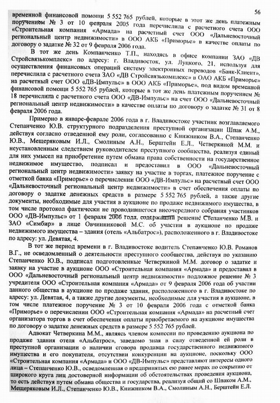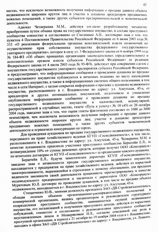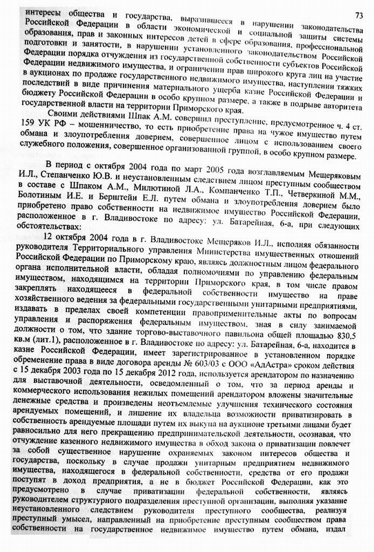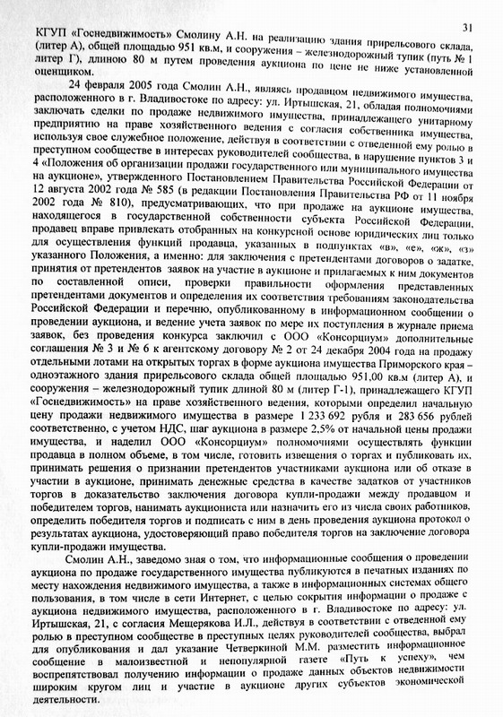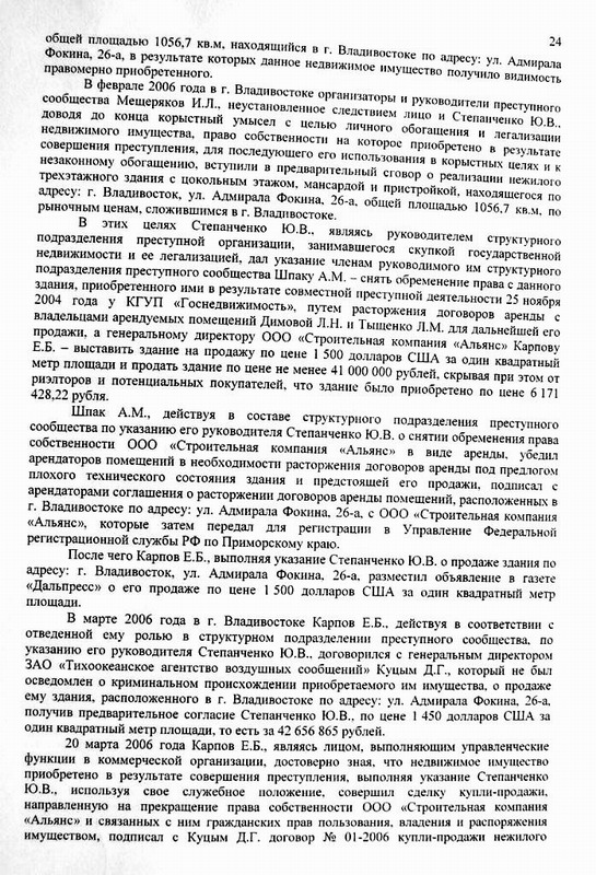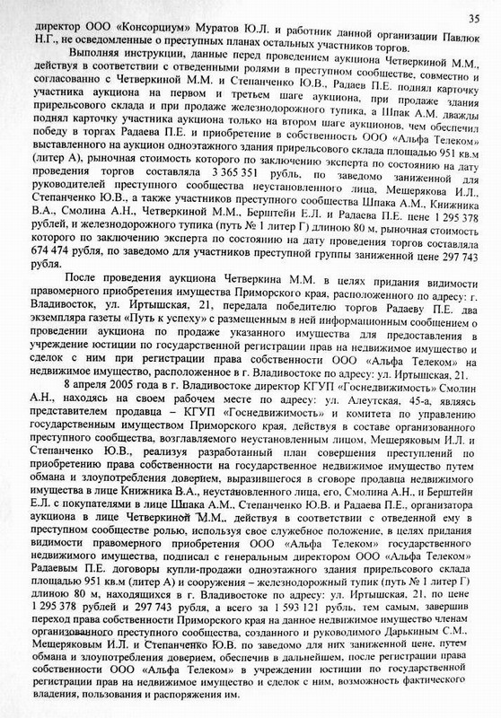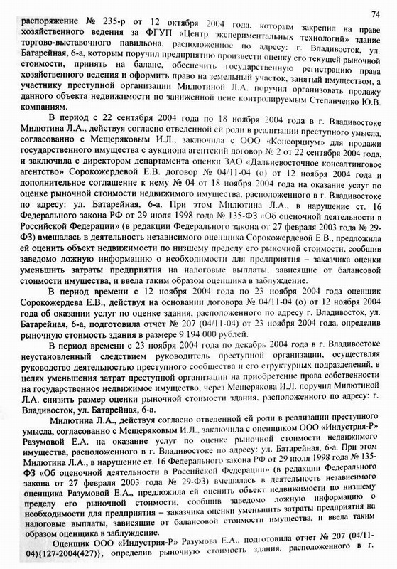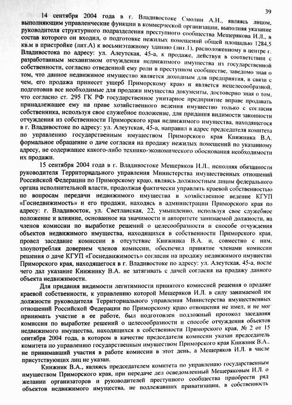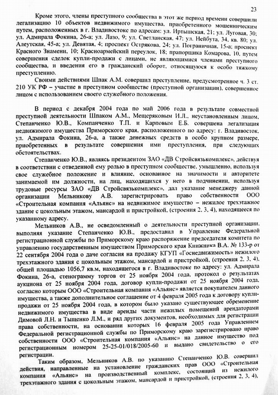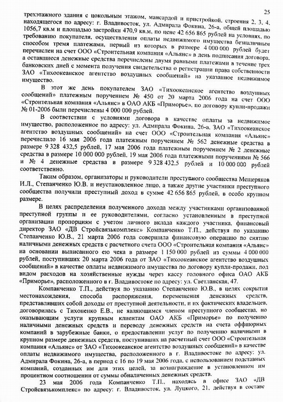 Вот общая суть дела: «В период с 2003 года по январь 2007 года участники преступного сообщества совершили 38 тяжких преступлений, в результате которых приобрели путем обмана и злоупотребления доверием, по умышленно заниженной цене объекты недвижимого имущества, находящиеся в собственности Приморского края, и объекты недвижимого имущества, находящиеся в собственности Российской Федерации (следует полный список объектов – на три листа), и причинен материальный ущерб Приморскому краю на сумму 227 934 967 рублей, Российской Федерации – 354 639 618 рублей, а всего на сумму 582 574 585 рублей, что является особо крупным размером».
