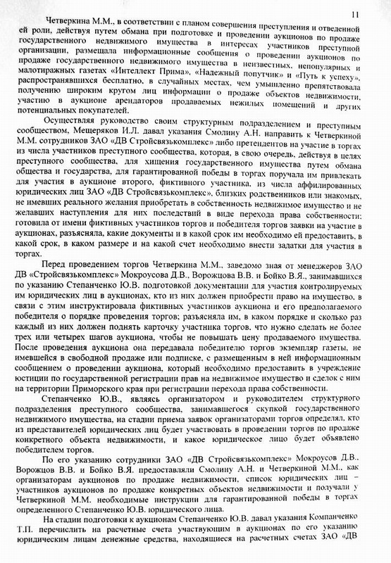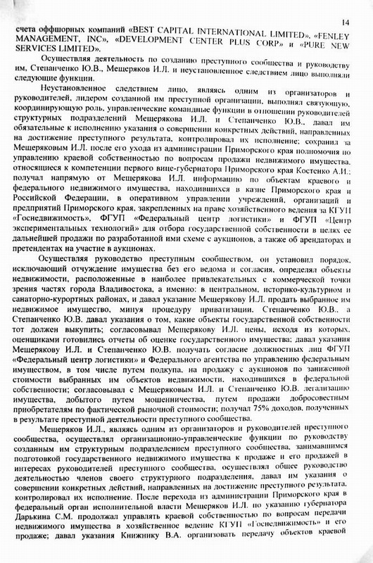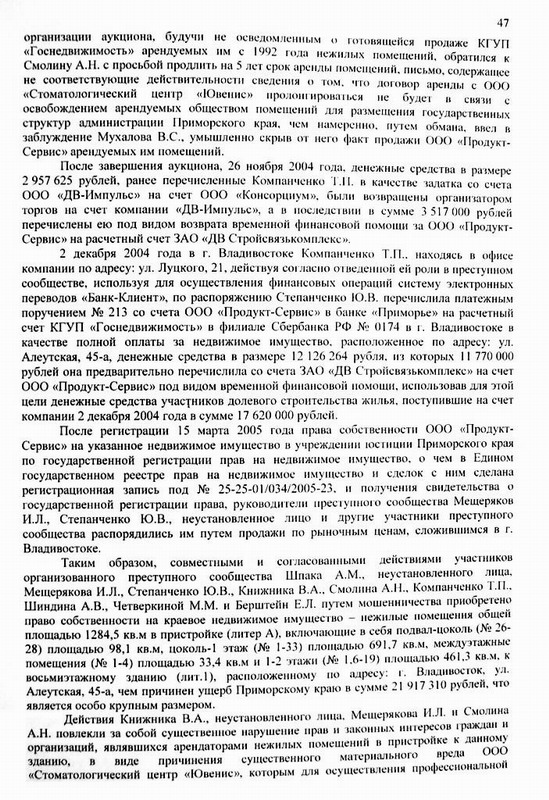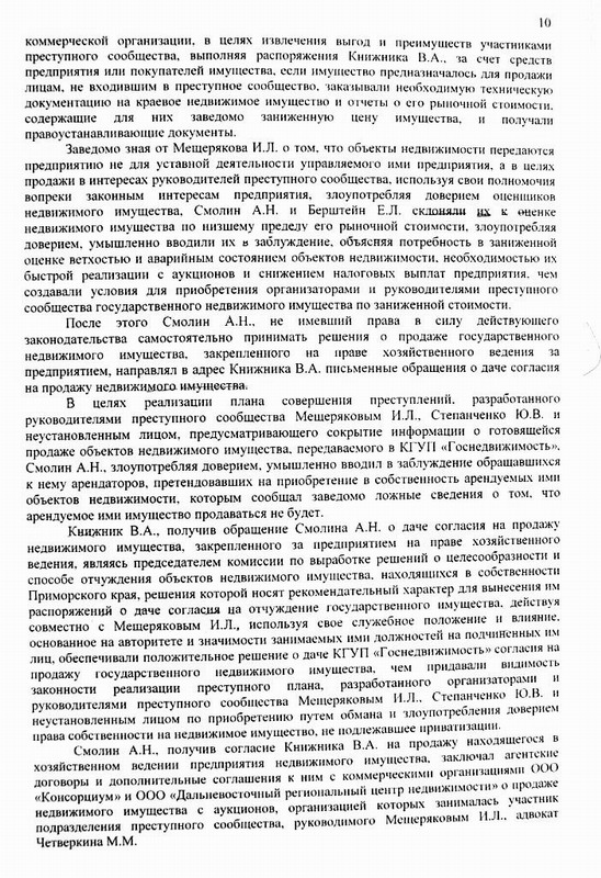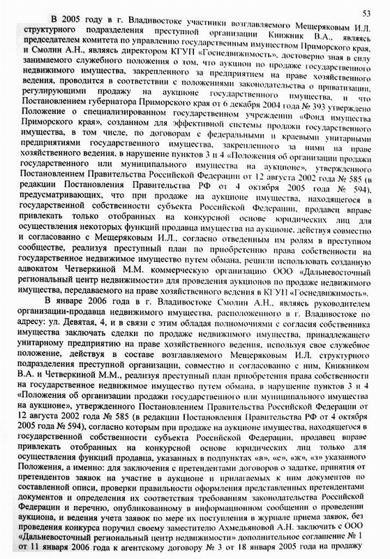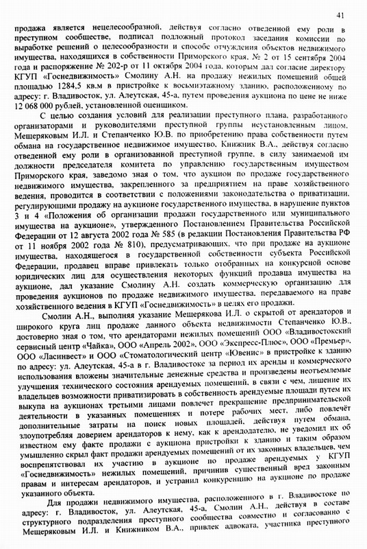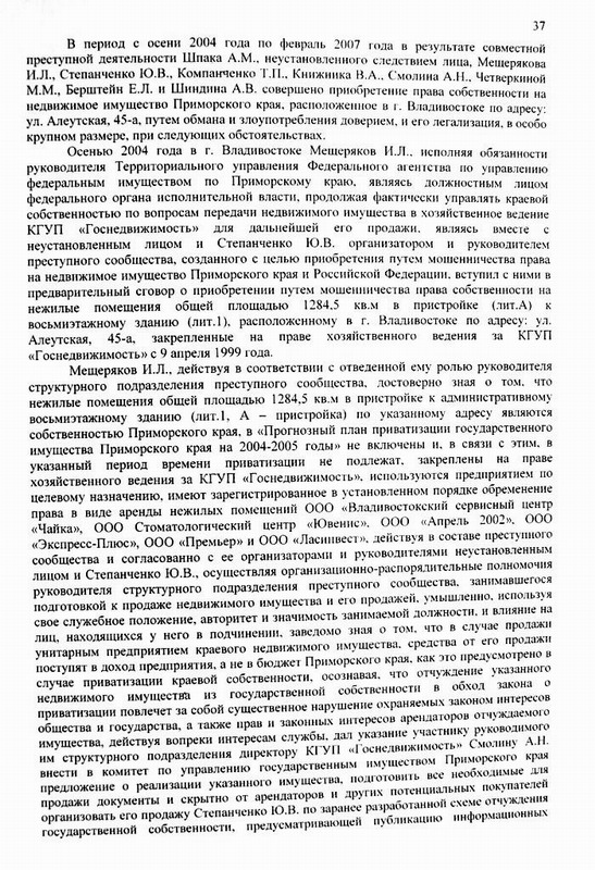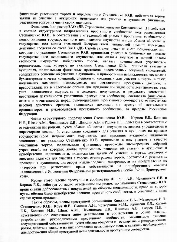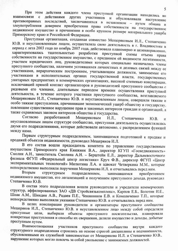 В документе подробно, скрупулезным юридическим языком, со множеством повторов описывается деятельность организованного преступного сообщества (Книжник, Мещеряков, Степанченко и мн. др.) вокруг недвижимости с целью обогащения.