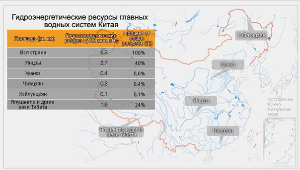 - Ялуцангпо и другие реки Тибета - гидроэнергетические ресурсы (100 млн. кВт) - 1,6; процент от общих ресурсов (%) – 24.
