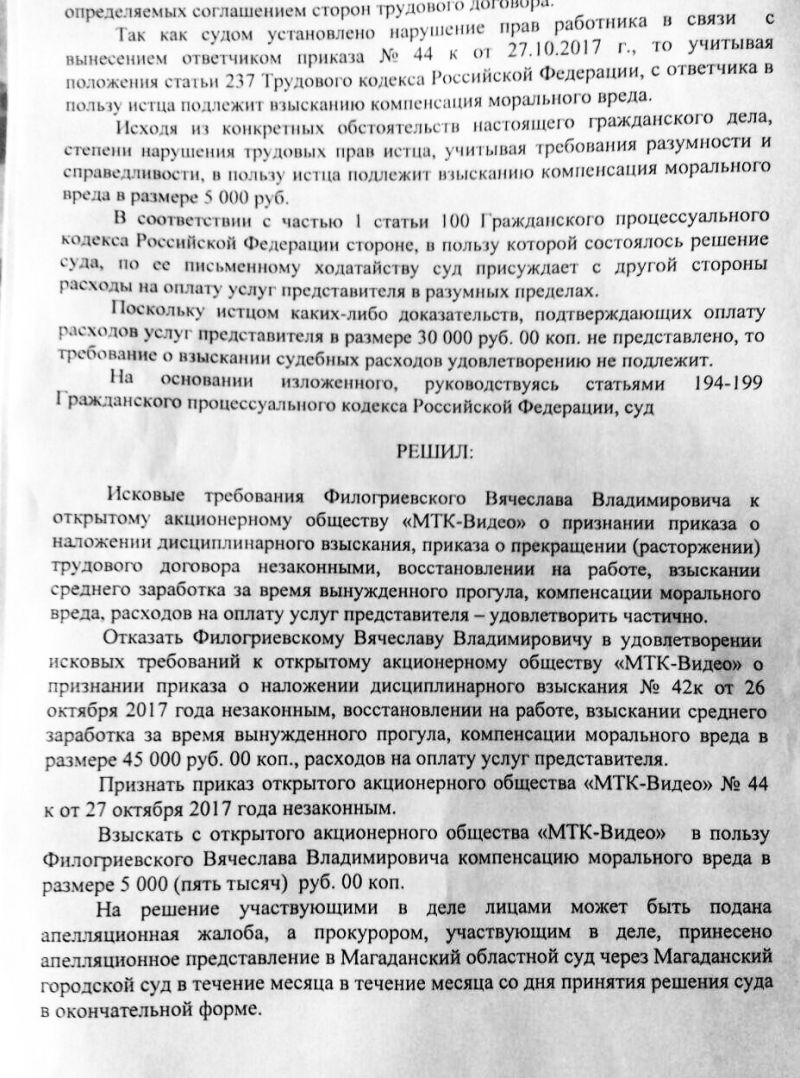 Напомним, шеф-редактор магаданской телекомпании «МТК» Вячеслав Филогриевский был уволен 27 октября прошлого года «по статье», то есть по совокупности дисциплинарных взысканий.