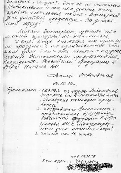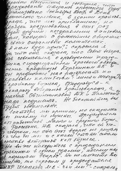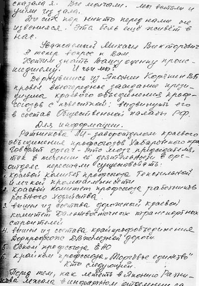 Письмо председателю ФНПР М. В. Шмакову: «Вернувшись из Японии, Корякин В. П. провел внеочередное заседание президиума краевого объединения профсоюзов с повесткой: выдвинуть его в состав Общественной палаты РФ…»