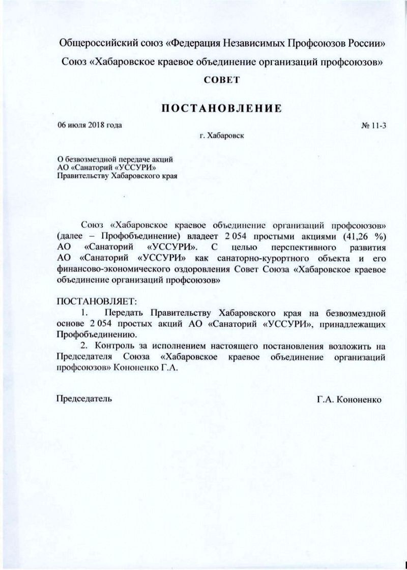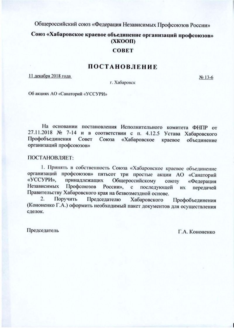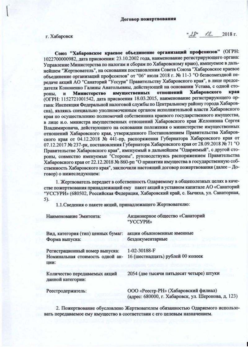 Хабаровское профобъединение также из своих средств производит оплату процедуры юридического оформления сделки безвозмездной передачи в государственную собственность Хабаровского края акций АО «Санаторий «Уссури», жертвователями которых являются физические лица, большинство из них - бывшие работники санатория.