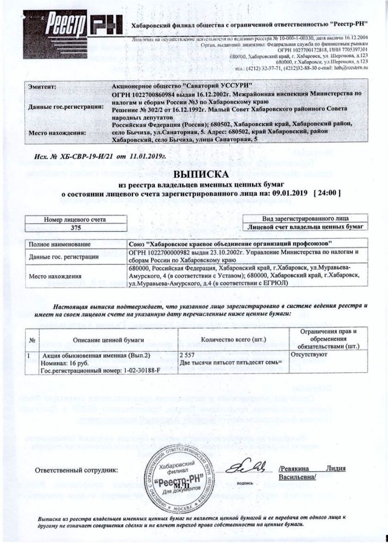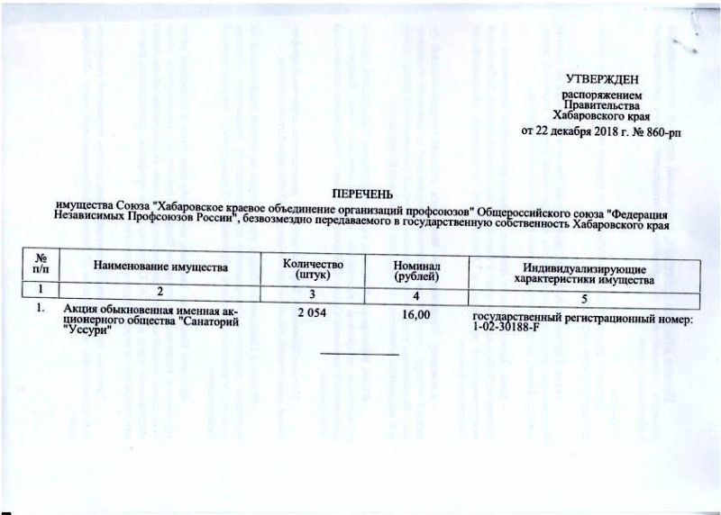 Всего профсоюзами безвозмездно было передано в государственную собственность Хабаровского края 2577 обыкновенных именных бездокументарных акций АО «Санаторий «Уссури» номинальной (первоначальной стоимости, определяемой при выпуске акций) стоимостью 16 рублей каждая на общую сумму 40912 рублей.