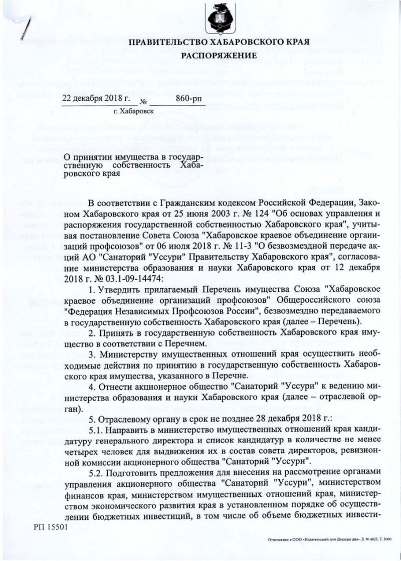22 декабря 2018 года распоряжением правительства Хабаровского края за № 860-рп принято решение о принятии имущества Союза «Хабаровское краевое объединение организаций профсоюзов» Общероссийского союза «Федерация независимых профсоюзов России», безвозмездно передаваемого в государственную собственность Хабаровского края. Этим же распоряжением акционерное общество «Санаторий «Уссури» отнесено к ведению министерства образования и науки Хабаровского края.