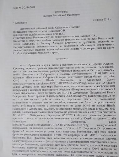 Райсуд признал "несоответствующими действительности, сведения, опубликованные на интернет-сайте Ютуб, распространенные Ворсиным Алексеем Юрьевичем, координатором штаба Навльного в Хабаровске, в сюжете, опубликованном 31.01.2019 под названием «Инновации» Хабаровской мэрии уничтожают малый бизнес".