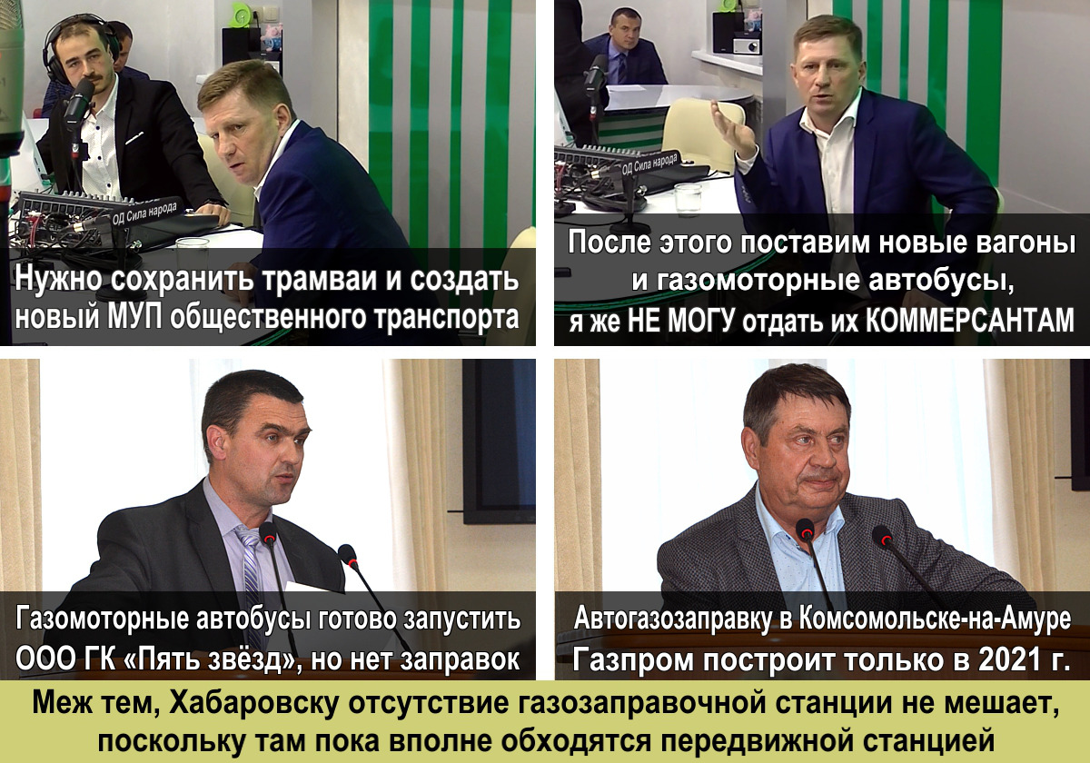 20 июня 2019 г. на заседании Общественного совета при Главе города Комсомольска-на-Амуре, посвящённом работе общественного транспорта, выступил начальник отдела транспорта и связи администрации города Александр Демидов. С его слов, запуск газомоторных автобусов готова произвести группа компаний «Пять звёзд», однако есть проблема в отсутствии заправок. И сообщил, что автобусы начнут работу, как только появится заправка. Ни о том, когда она появится, ни о том, ведутся ли какие-то работы в этом направлении, ни, главное, о том, почему сейчас идёт речь о поставке газомоторных автобусов группой компаний «Пять звёзд», в то время как Фургал увязывал поставку таких автобусов именно для муниципального предприятия общественного транспорта, которое предполагалось создать, Демидов не сообщил. Будто и не озвучивалась тысячу раз проблема отсутствия муниципальных автобусов, как и проблема того, каким образом наладить рентабельную работу трамвайного управления… Складывается такое впечатление, что чиновникам администрации города не то, что делать, даже думать не хочется о воссоздании муниципального общественного транспорта.