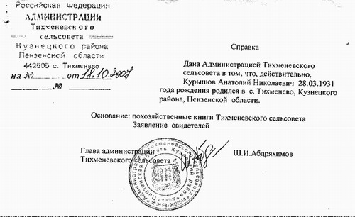 Между тем, история бюрократической халатности, выявленная еще при жизни сержанта Павлова, должна быть известна уже всем ответственным лицам. Отец Анатолия Николаевича, вернувшись с фронта, перевез семью товарняком в Комсомольск-на-Амуре. Обустроив кое-как жену и детей в городе юности, глава семейства отправился обратно в родное Тихменево - продавать дом и оформлять для родных паспорта. Деньги за вырученное имущество батя стал сразу пропивать вместе с сельскими фронтовиками, да, наверное, с похмелья надиктовал в сельсовете несуразицу о времени появления своего сына на свет...