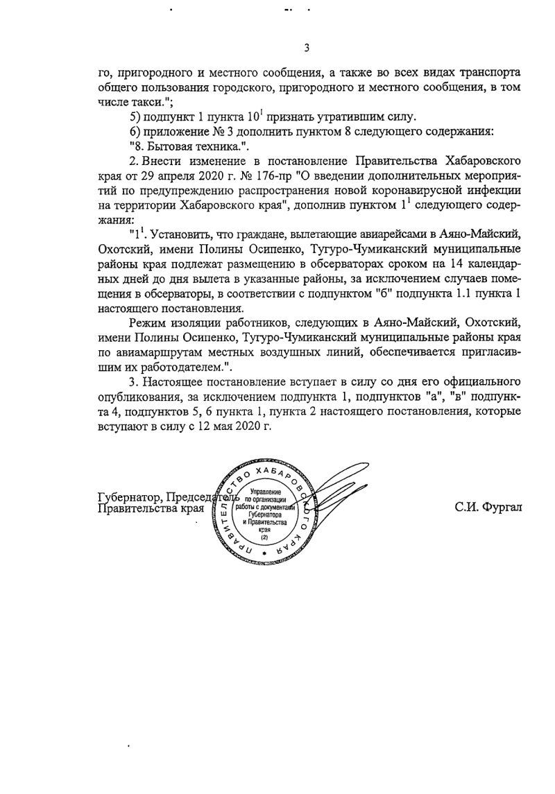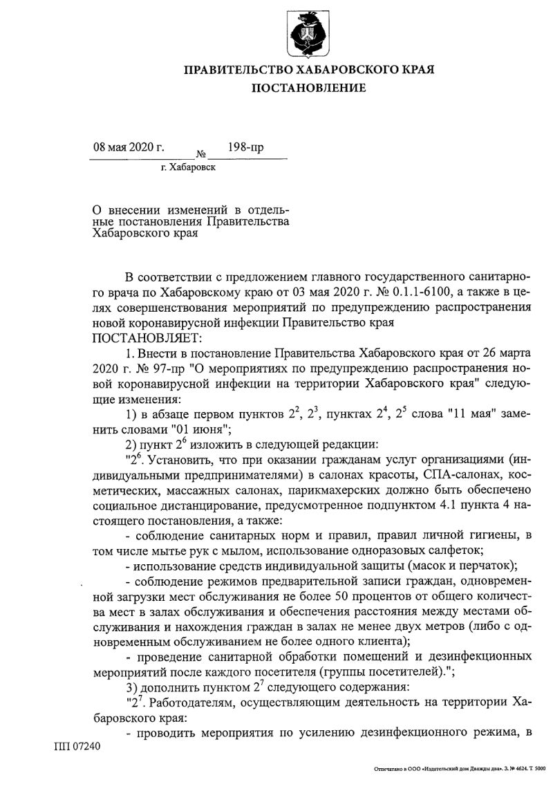 Режим самоизоляции в Хабаровском крае продлен до 1 июня. Постановление об этом (о внесении изменений в отдельные постановления края за №198-пр от 8.5.20) подписал губернатор края Сергей Фургал.