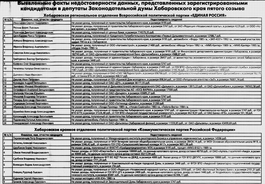 Выявленные факты недостоверности данных, предоставленных зарегистрированными кандидатами в депутаты Законодательной думы Хабаровского края пятого созыва