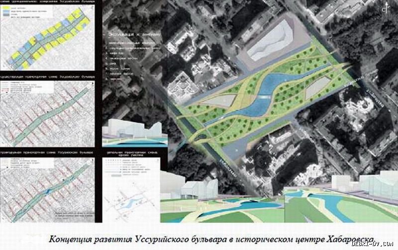 По словам заместителя директора Института архитектуры и строительства (ИАиС) в составе ТОГУ Натальи Ткаченко, целую неделю студенты представляли свои проекты, а профессура читала показательные лекции. В архитектурных проектах, конечно, много еще неопределенного. Но все же – это уже направление развития. Уссурийский бульвар под водой На международном форуме в ТОГУ была озвучена концепция реконструкции Уссурийского бульвара. Предложено частично восстановить реку Плюснинку.  | | Уссурийский бульвар зальют водой. Нажмите, чтобы УВЕЛИЧИТЬ | (function(w, d, n, s, t) { w[n] = w[n] || []; w[n].push(function() { Ya.Context.AdvManager.render({ blockId: "R-A-127969-6", renderTo: "yandex_rtb_R-A-127969-6", async: true }); }); t = d.getElementsByTagName("script")[0]; s = d.createElement("script"); s.type = "text/javascript"; s.src = "//an.yandex.ru/system/context.js"; s.async = true; t.parentNode.insertBefore(s, t); })(this, this.document, "yandexContextAsyncCallbacks"); |