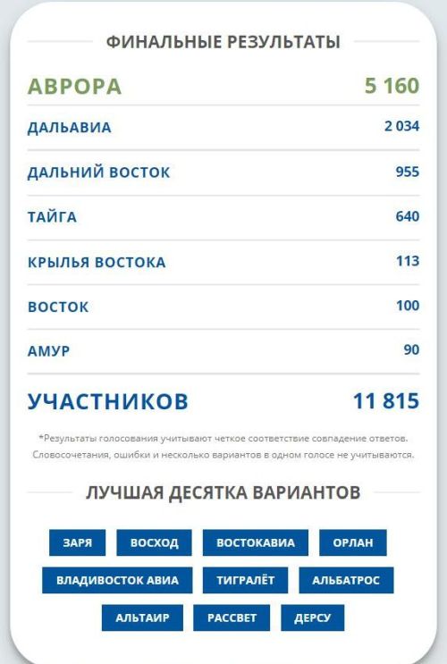 В топ-5 популярных вариантов вошли «Дальавиа», «Дальний Восток», «Тайга» и «Крылья Востока». Наиболее активное участие в голосовании приняли жители Приморского, Хабаровского, Камчатского краев, Амурской и Магаданской областей.