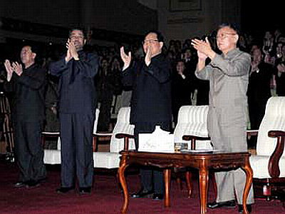| 3 апреля глава КНДР Ким Чен Ир в сопровождении министра народных вооруженных сил вице-маршала Ким Ён Чуна, других высокопоставленных лиц (справа налево) посетил Художественный театр Мансудэ в Пхеньяне |