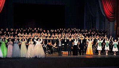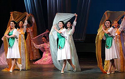 | Артисты ансамбля Мансудэ исполняли песню «Тоска по родине» и дали революционную оперу «Цветочница» |