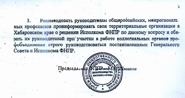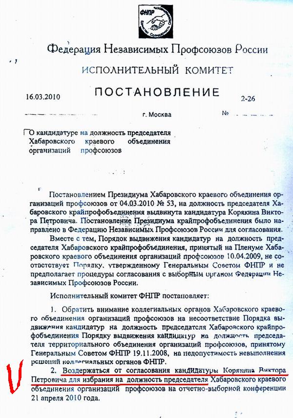 Исполком воздержался и от согласования кандидатуры Корякина для избрания председателем крайпрофобъединения на предстоящей отчетно-выборной конференции. О чем есть постановление Исполнительного комитета ФНПР, г. Москва, № 2-26 от 16.03.10. Примечательно, что легитимность его избрания на пленуме Хабаровского краевого объединения организаций профсоюзов в декабре 2008 года Федерацией независимых профсоюзов также не подтверждена…