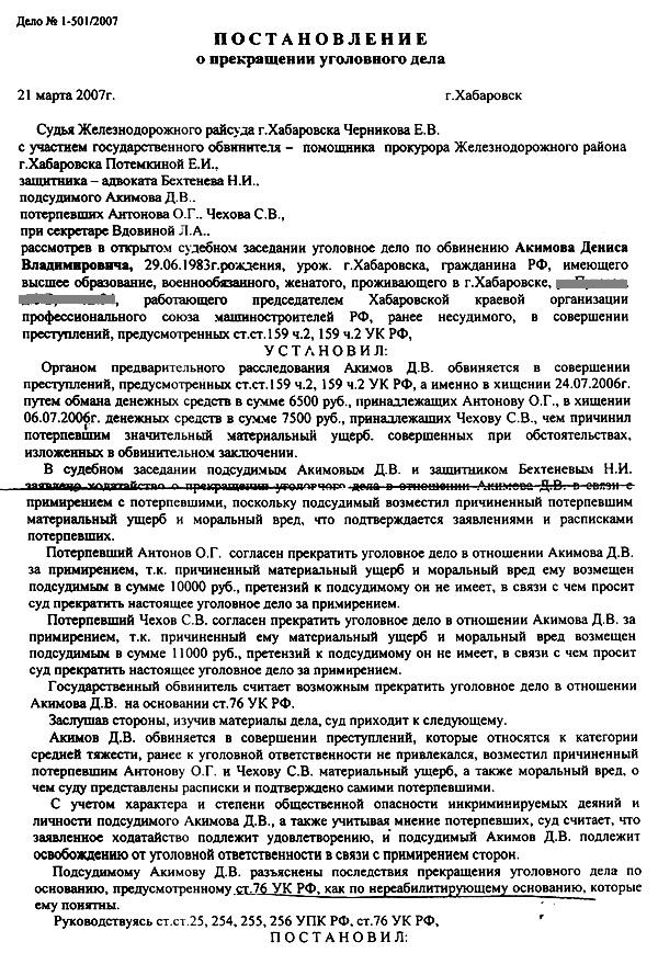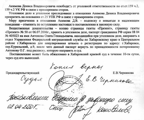 Похоже, предстоящая отчетно-выборная конференция Хабаровского краевого объединения организаций профсоюзов является мощным сдерживающим фактором в широкомасштабной деятельности Виктора Петровича Корякина. Не удивительно, что подготовка к конференции и подбор кадров Корякиным осуществляется на принципах приоритета лояльности к своей персоне. В дальнейшем, на должность своего заместителя большой профсоюзный босс планирует, как мы слышали, выдвинуть господина Акимова, непродолжительная деятельность которого в должности председателя крайкома профсоюзов машиностроителей дает повод усомниться в его профессионализме и чистоте помыслов. Этот молодой работник, не проявив себя в профработе, достаточно хорошо известен работникам правоохранительных органов. В 2007 году в отношении Акимова было возбуждено уголовное дело № 1-501/2007 по статье 159 УК РФ «Мошенничество». Прекратили то дело в Железнодорожном суде Хабаровска (судья Е. В. Черникова) за примирением сторон по ст. 76 УК РФ (по нереабилитирующему основанию). Но у нас то все знают, как можно примириться… Хотя кандидатуру зама можно выбрать из резерва и не одну, кроме уже действующего зама Корякина.