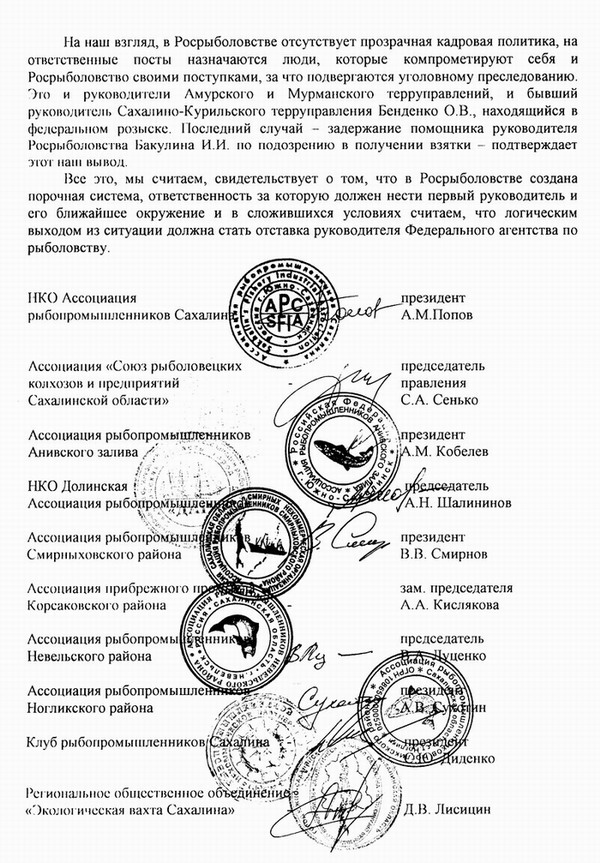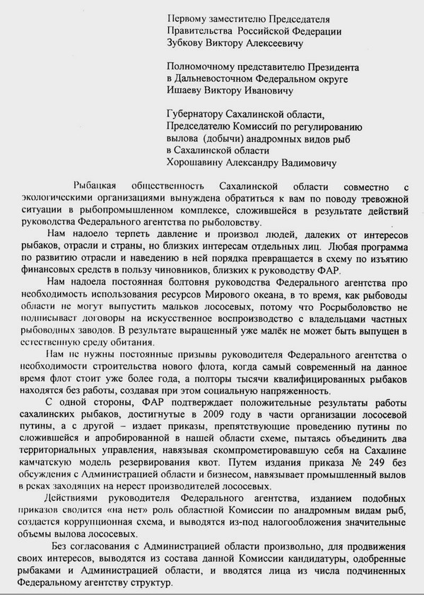 Руководители сахалинских ассоциаций рыбопромышленников, объективно оценивая происходящее, направили по этому поводу письма В. Зубкову, В. Ишаеву, губернатору Сахалинской области, председателю Комиссии по регулированию вылова (добычи) анадромных видов рыб А. Хорошавину с таким текстом: