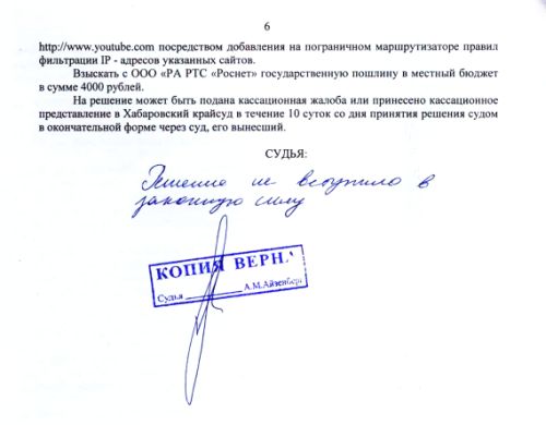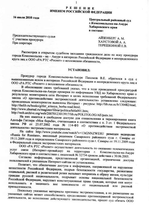 В распоряжении CNews оказалось решение центрального районного суда Комсомольска-на-Амуре (скачать копию документа), которое обязывает местного интернет-провайдера «РА РТС «Роснет», среди прочего, закрыть доступ абонентов к сайту youtube.com. С иском в суд обратился прокурор города Владимир Пахомов. В его заявлении говорится, что в ходе проведенной ведомством по информации местного УВД проверки были обнаружены экстремистские материалы, а именно книга Адольфа Гитлера «Моя борьба», на сайтах lib.rus.ec, zhurnal.ru, thelib.ru и web.archive.org. Отметим, что последний из них – это даже не библиотека, а просто «машина времени», сохраняющая содержимое проиндексированных веб-сайтов, каким оно было в разные годы.