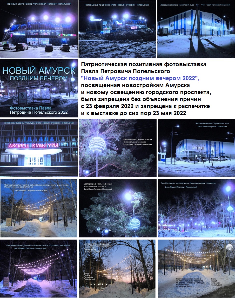 Причем фотовыставка "Ночной Амурск поздним вечером" была запрещена именно с 23 февраля 2022 по сей день 23 мая 2022. У меня есть мнение, что это не просто так увязано с 23 февраля 2022.