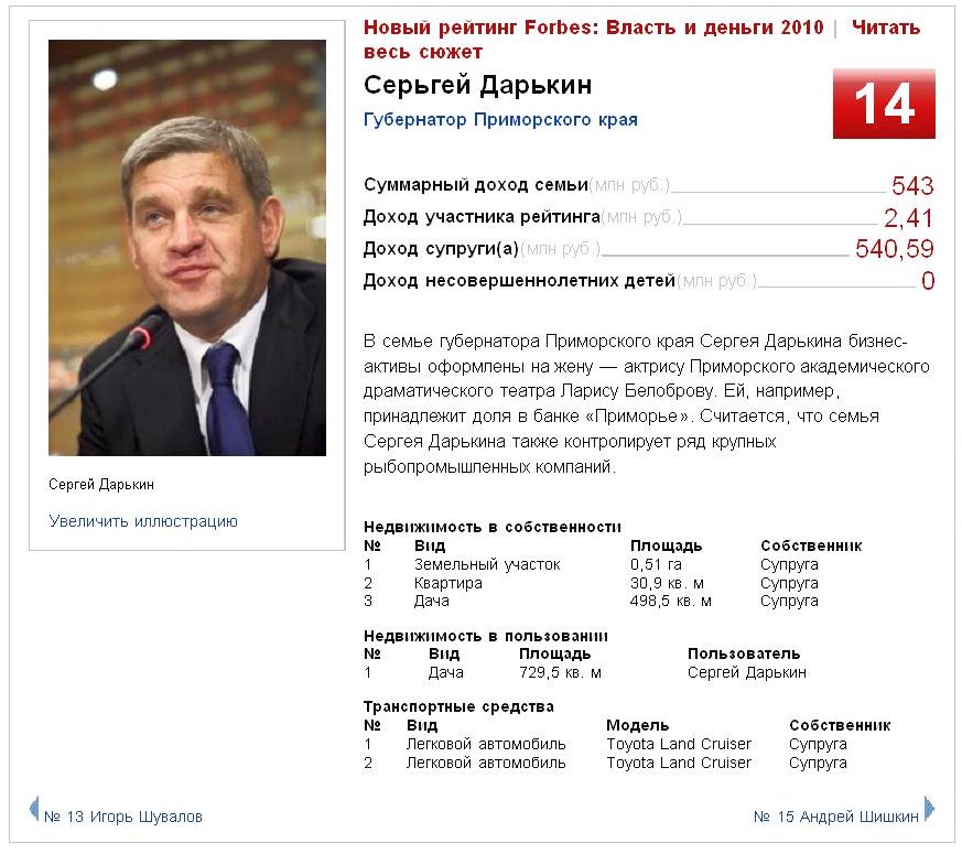 В семье губернатора Приморского края Сергея Дарькина бизнес-активы оформлены на жену — актрису Приморского академического драматического театра Ларису Белоброву. Ей, например, принадлежит доля в банке «Приморье». Считается, что семья Сергея Дарькина также контролирует ряд крупных рыбопромышленных компаний (Власть и деньги — 2010. Рейтинг Forbes)
