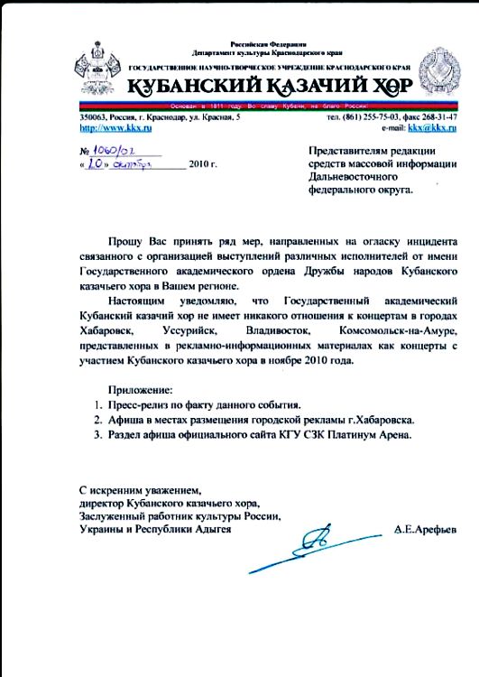 Факт наличия рекламно-информационных материалов о предстоящих гастролях якобы Кубанского казачьего хора говорит о том, что на Дальнем Востоке действует преступная схема, целью которой, скорей всего, является получение прибыли за счет ошеломляющего успеха, который сопутствовал Кубанскому казачьему хору в недавних гастролях по Дальнему Востоку (май 2010г.). Подобное происшествие наводит тень не только на всемирно известное имя старейшего творческого коллектива России, который готовится отметить в 2011 году 200-летний юбилей, но и на всю культурную общественность Дальневосточного региона, которой пытаются навязать лжегастроли.