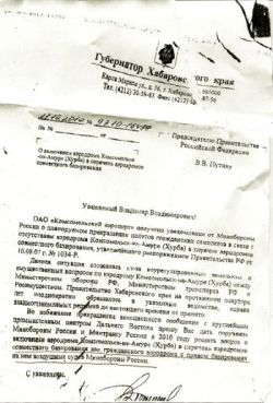 Официальное письмо (9.3.10-16488) Вячеслава Шпорта в адрес Председателя Правительства РФ с просьбой «дать поручение Минобороны и Минтрансу …во избежание прекращения авиационного сообщения с крупнейшим промышленным центром Дальнего Востока» Комсомольска-на-Амуре. ФОТОфакт