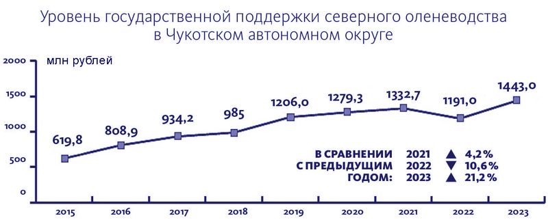 Несмотря на сложности, которые испытывает северное оленеводство на Чукотке, господдержка отрасли в последние годы постоянно росла - с 619,8 млн в 2015 году до 1 млрд 443 млн в 2023-м. Исключение составил только 2022 год, когда она сократилась на 10,6%, но уже в 2023-м возобновила поступательный рост.