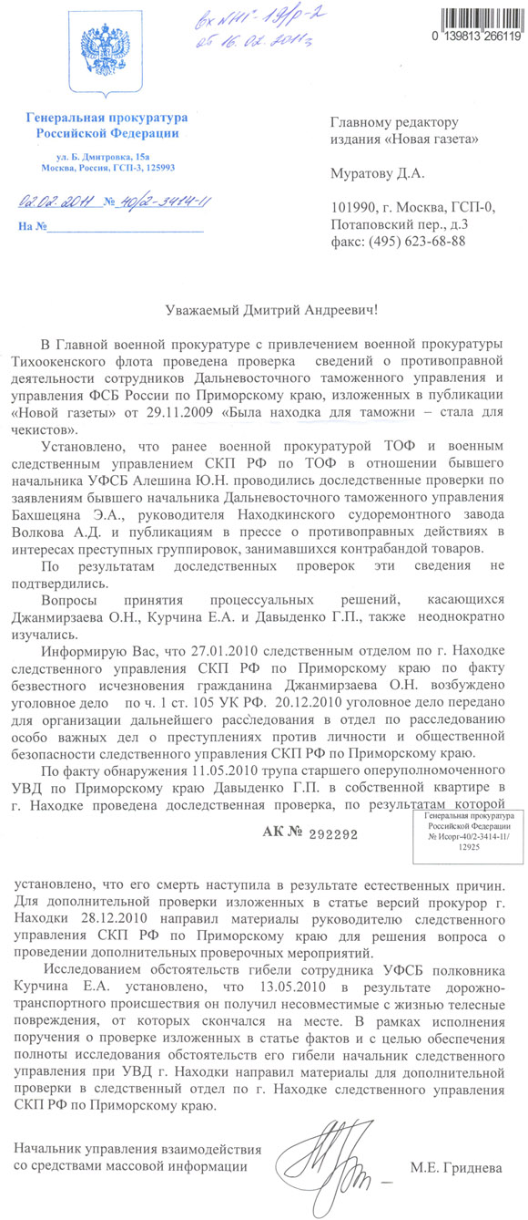В статье «Была Находка для таможни, стала — для чекистов» мы поместили лишь небольшие отрывки из этого интервью, но и их, по нашему мнению, должно было хватить для серьезного разбирательства, а, возможно, и для возбуждения уголовных дел в отношении приморских силовиков. Но все закончилось более чем печально. Через месяц после интервью Омари Джанмирзаев вышел на какую-то важную встречу и бесследно исчез. А через месяц после наших публикаций пришел ответ из Генеральной прокуратуры, которая проинформировала редакцию о том, что проверка Главной военной прокуратуры не выявила никаких нарушений со стороны генерала ФСБ Юрия Алешина.