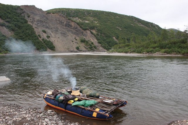 Омолон мне не понравился. Обыкновенная река, изобилующая излучинами, узкими протоками и «расчёсками» - вырванными из берегов стволами деревьев. Местами река часто петляет, и надо быть внимательным, чтобы не влететь, а течение быстрое, но в целом без трудностей. Горные склоны на отдалении и не впечатляют.