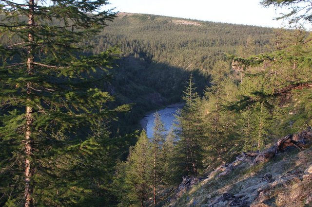 Тем яснее, что эта топография заранее угадывается по вершине, которой венчается содержащий «каньон» массив – вершине Ущельной. Больших красот мы тоже здесь не увидели. А вот предшествующий ущелью массив 1315 м, который огибает Парень – да, впечатлил. Двухсотметровые таёжные склоны, и там, внизу, скрывается в скорой излучине река.
