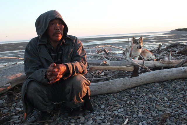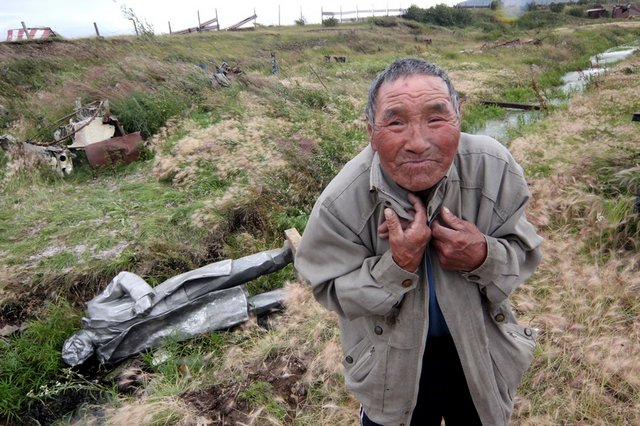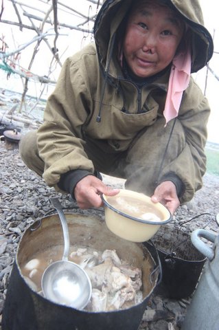 Первые люди повстречались за устьем Хопкинея: коряки Степан, Вера и Сергей занимаются заготовкой рыбы для бригады оленеводов. Степан, самый старший, охотно и с живостью рассказал о жизни в тундре. Он с измальства ходил в табунах, и не хочет покидать привычной среды. Он с любовью и какой-то сказочностью отвечал на наши вопросы с врождённой открытостью. Сегодня в бригаде всего 700 оленей, это всё, что осталось от большого совхоза. Нас с ходу напоили чаем, угостили варёными брюхами и молоками кетин. Сахара – маленькая баночка, к чаю - ничего, видно, как экономно живут эти люди. Юкольник – каркас из сбитых жердей для сушки рыбы, полу-землянка из тёсаных бревен да летняя кухня из закинутых половодьем досок, вот и вся их житница. Юля тут же отдала детям свои орехи, которые несла на себе 200 км, ещё что-то. В последствии у нас не раз была возможность убедиться, что рыба – основной пищевой продукт у коряков, всякие там макароны, рис – лишь дополнение. Исторически выработалась номенклатура разделки кеты: брюхо – «теша», затем спинка, следом срезают «юколу» – попросту боковины, затем «телешка» – филе, остаётся голова и хребет. И вот что меня удивило: всё идёт в дело, ничего не выбрасывается! Рыбу сушат и потом варят, кости идут собакам. Из голов делают особенный деликатес, их сбраживают, иногда с икрой, до кислого состояния. Вонючее блюдо это называется «кислые головки». Стреляют и нерпу.