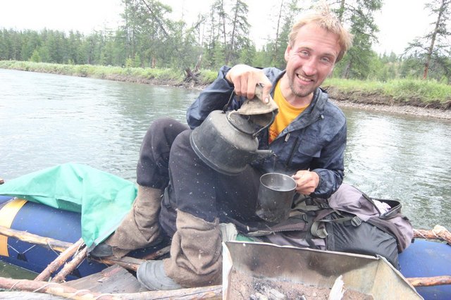 А это, собственно, автор всех фотографий - Дима Арбузов (сфотографирован мною с моего баллона нашего катамарана на Омолоне):
