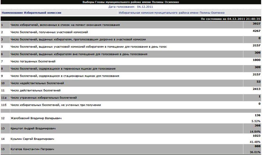 Выборы депутатов Государственной Думы ФС РФ шестого созыва. В Приморском крае за «Единую Россию» в ДФО проголосовало меньше всех — 34,6%, Хабаровский край - 37,7%. Лидер — Чукотка — 70,3%. Больше всех за КПРФ в регионе проголосовало на Сахалине — 23,4%, в Приморском крае - 22,7% (данные предварительные)