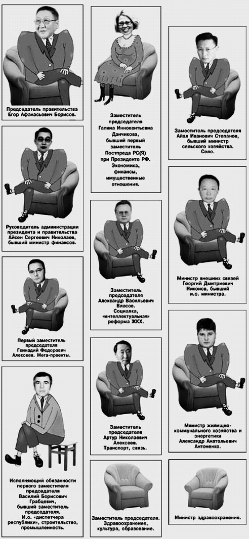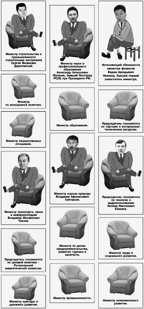 Увидеть всегда лучше, чем услышать или прочесть. Сегодня кабинет министров, прошедший через голосование в Ил Тумэне или утвержденный «именными» указами президента республики Вячеслава Штырова, выглядит так.