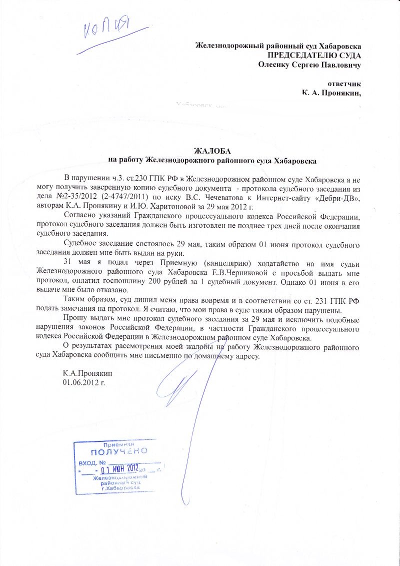 В нарушении ч.3. ст.230 ГПК РФ в Железнодорожном районном суде Хабаровска я не могу получить заверенную копию судебного документа - протокола судебного заседания из дела №2-35/2012 (2-4747/2011) по иску В.С. Чечеватова к Интернет-сайту «Дебри-ДВ», авторам К.А. Пронякину и И.Ю. Харитоновой за 29 мая 2012 г.