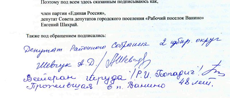 Сейчас решается вопрос, кого именно из кандидатов поддержит Правительство Хабаровского края на предстоящих выборах главы Ванинского муниципального района. От этого выбора многое зависит. Просим Вас поддержать действительно и бесспорно достойного кандидата на должность главы Ванинского муниципального района, но не Мусяновича Б.М., запятнавшего свою репутацию сомнительными сделками».