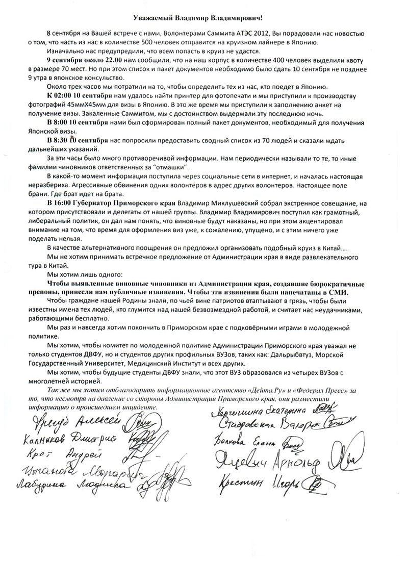 8 сентября на Вашей встрече с нами, Волонтерами Саммита АТЭС 2012, Вы порадовали нас новостью о том, что часть из нас в количестве 500 человек отправится на круизном лайнере в Японию. Изначально нас предупредили, что всем попасть в круиз не удастся.
