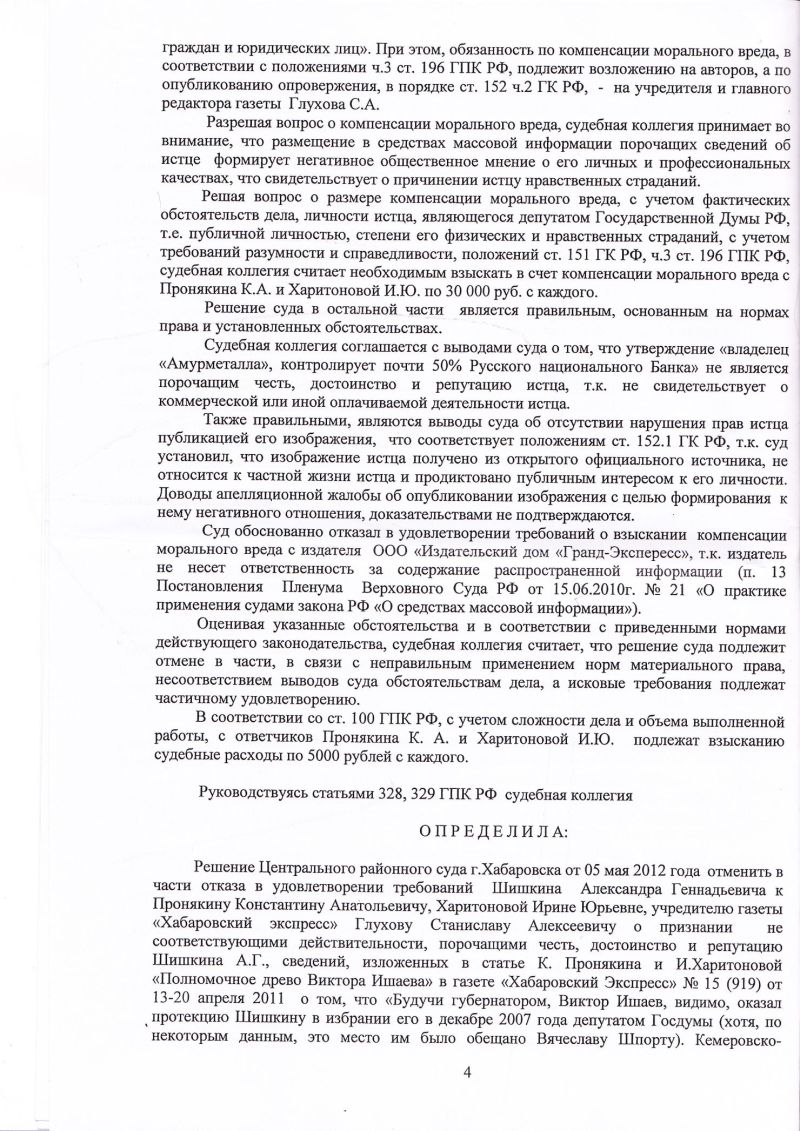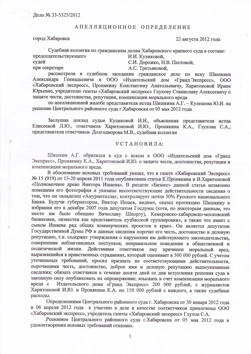 рассмотрела в судебном заседании гражданское дело по иску Шишкина Александра Геннадьевича к ООО «Издательский дом «Гранд Экспресс», ООО «Хабаровский экспресс», Пронякину Константину Анатольевичу, Харитоновой Ирине Юрьевне, учредителю газеты «Хабаровский экспресс» Глухову Станиславу Алексеевичу о защите чести, достоинства, репутации, компенсации морального вреда