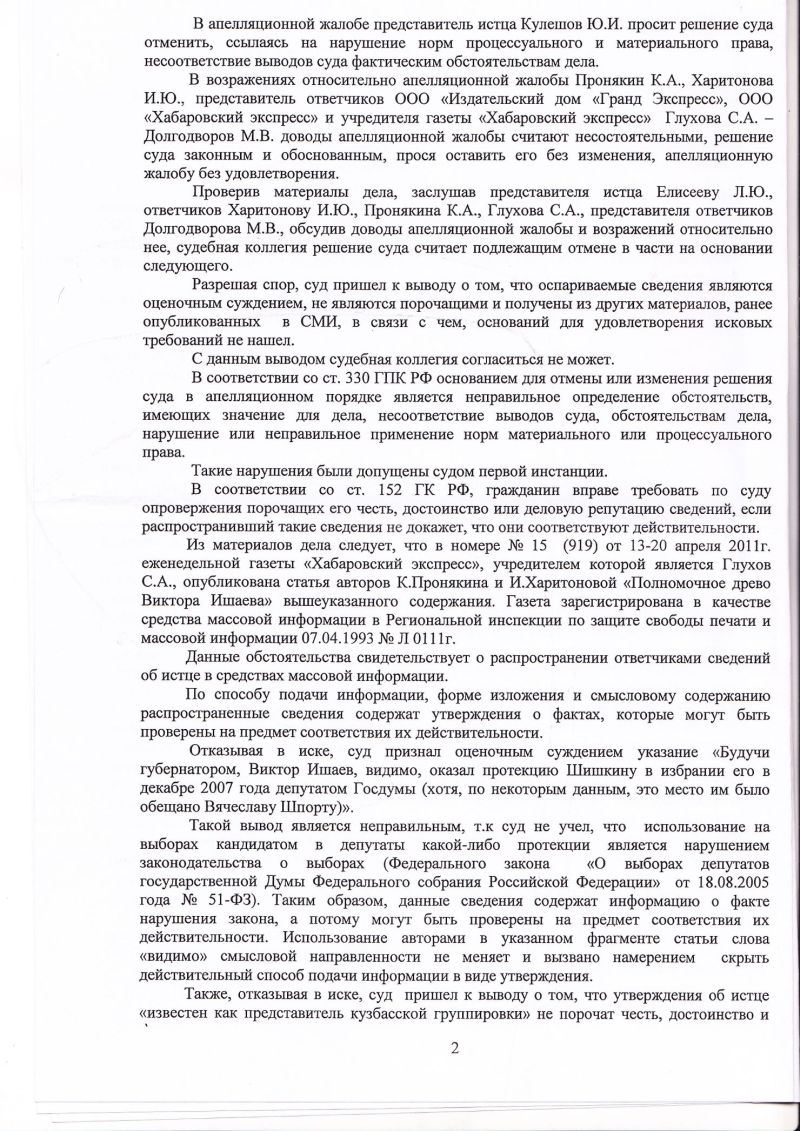 В номере 15 (919) газеты «Хабаровский Экспресс» за 13-20 апреля 2011 года опубликована статья авторов Константина Пронякина и Ирины Харитоновой «Полномочное древо Виктора Ишаева», в которой содержатся сведения в отношении Шишкина Александра Геннадьевича следующего содержания: «Будучи губернатором, Виктор Ишаев, видимо, оказал протекцию Шишкину в избрании его в декабре 2007 года депутатом Госдумы (хотя, по некоторым данным, это место им было обещано Вячеславу Шпорту), Кемеровско-хабаровско-московский бизнесмен, «известен как представитель кузбасской группировки», а также что имеет с сыном Ишаева ряд общих коммерческих проектов в крае». Данные сведения не соответствуют действительности».