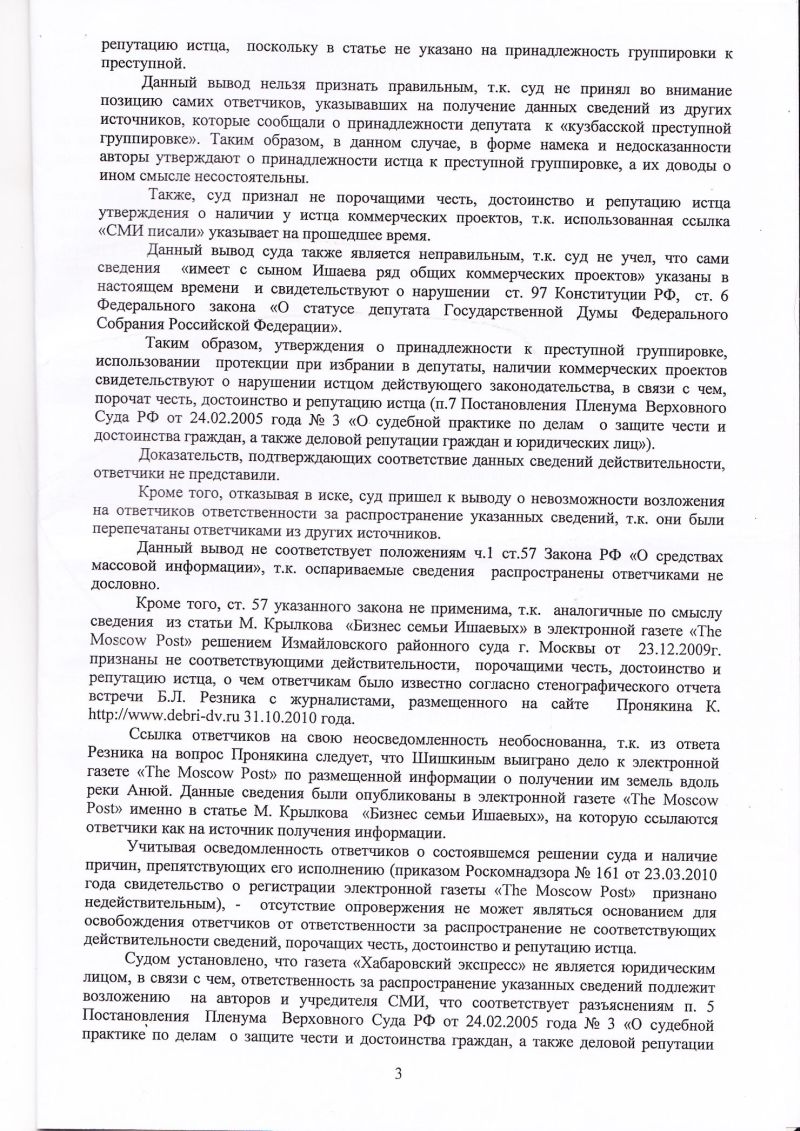 Ссылка ответчиков на свою неосведомленность необоснованна, т.к. из ответа Резника на вопрос Пронякина следует, что Шишкиным выиграно дело к электронной газете «The Moscow Post» по размещенной информации о получении им земель вдоль реки Анюй. Данные сведения были опубликованы в электронной газете «The Moscow Post» именно в статье М. Крылкова «Бизнес семьи Ишаевых», на которую ссылаются ответчики как на источник получения информации.