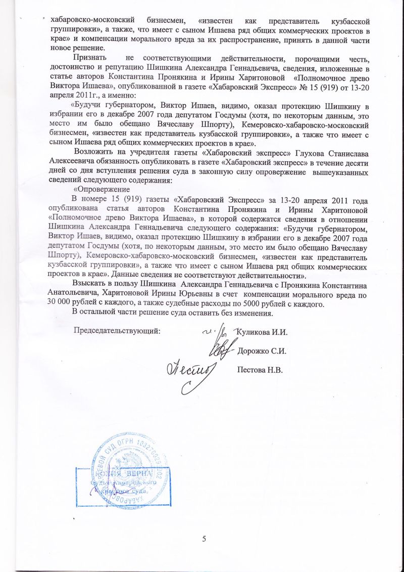 Признать не соответствующими действительности, порочащими честь, достоинство и репутацию Шишкина Александра Геннадьевича, сведения, изложенные в статье авторов Константина Пронякина и Ирины Харитоновой «Полномочное древо Виктора Ишаева», опубликованной в газете «Хабаровский Экспресс» № 15 (919) от 13-20 апреля 2011г., а именно: