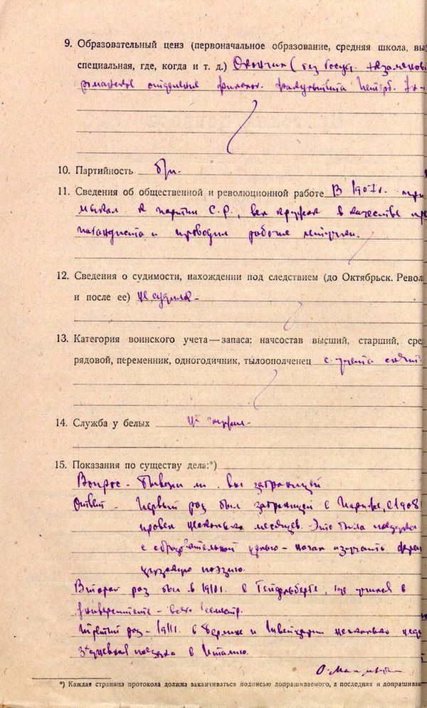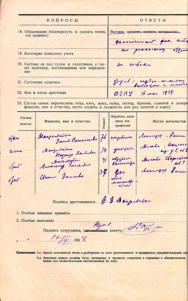 | Анкета арестованного О. Э. Мандельштама от 16 мая 1934 года. |