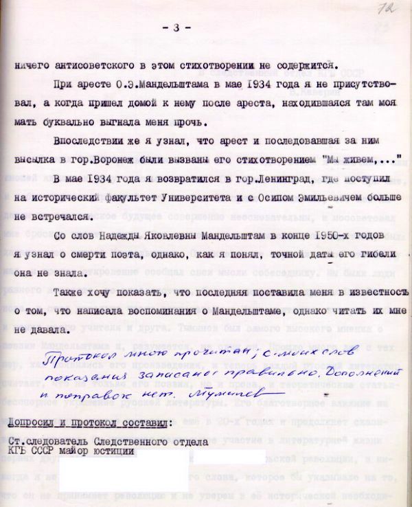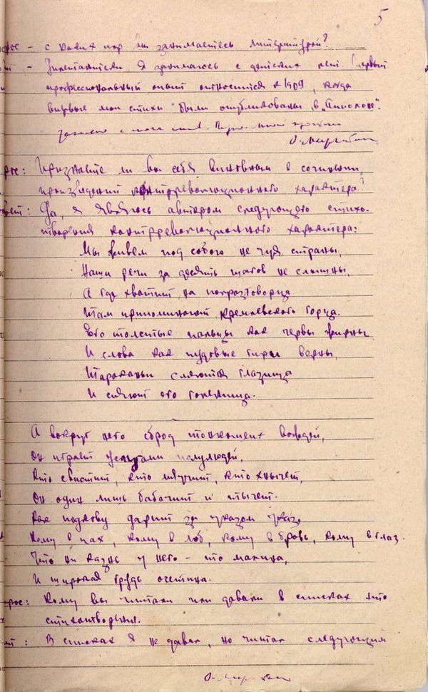 | Протокол допроса О. Э. Мандельштама оперуполномоченным 4-го отделения Секретно-политического отдела ОГПУ Н. Х. Шиваровым от 25 мая 1934 года. |
