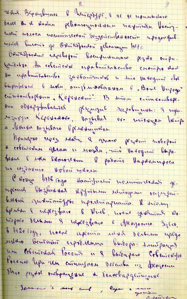 [л.11] По возвращению в Советскую Россию я вростаю в советскую действительность первоначально через литературный быт, а впоследствии - непосредственной работой: редакционно-издательской и собственно-литературной. Для моего политического и социального сознания становится характерным возрастающее доверие к политике Коммунистической партии и советской власти.