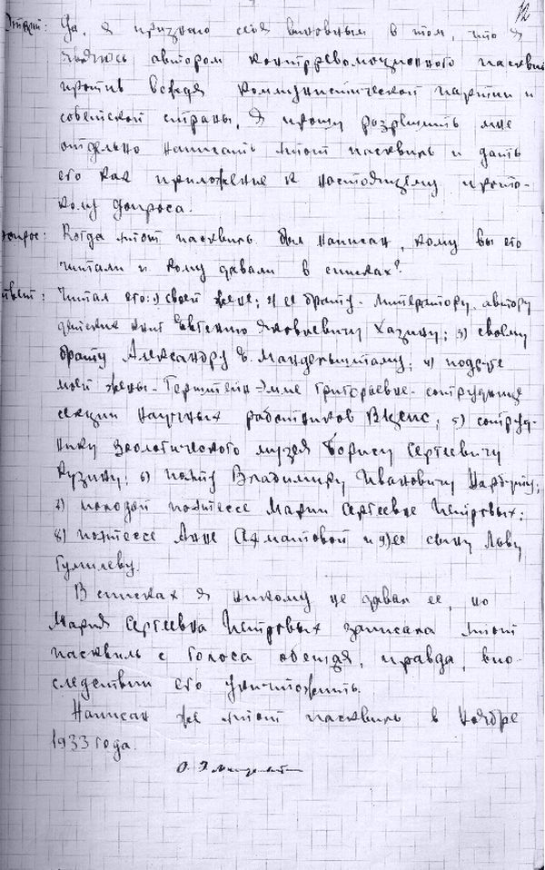 | Протокол допроса О. Э. Мандельштама оперуполномоченным 4-го отделения Секретно-политического отдела ОГПУ Н. Х. Шиваровым от 18 и 19 мая 1934 года. |