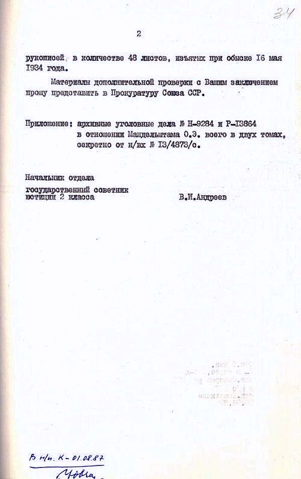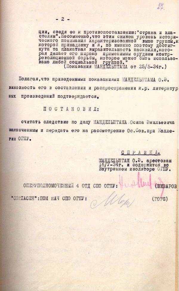 | Обвинительное заключение по делу О. Э. Мандельштама от 25 мая 1934 года и расписка об окончании следствия. |