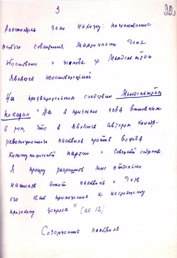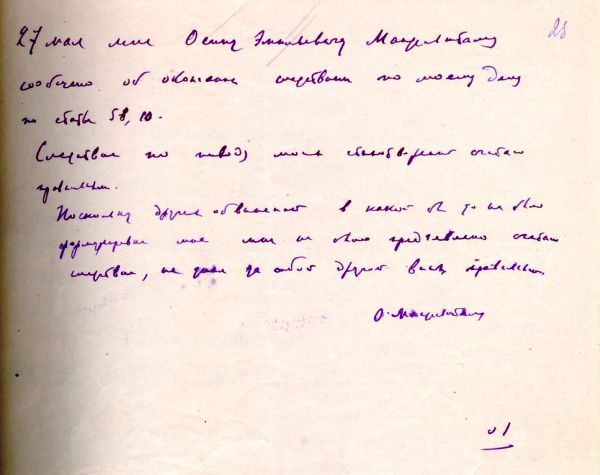 ЦА ФСБ РФ. Ф. Р-33487. Л. 29. На обороте чернилами: «Настоящее постановление мне оглашено 28 мая 1934 года. О.Э.Мандельштам.»