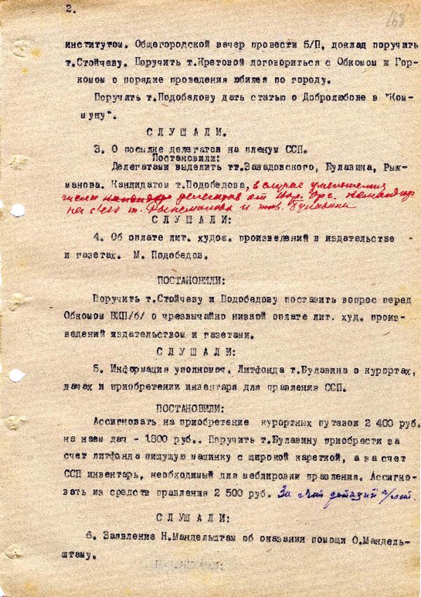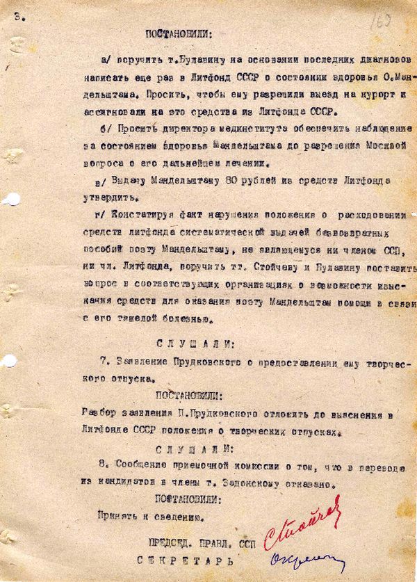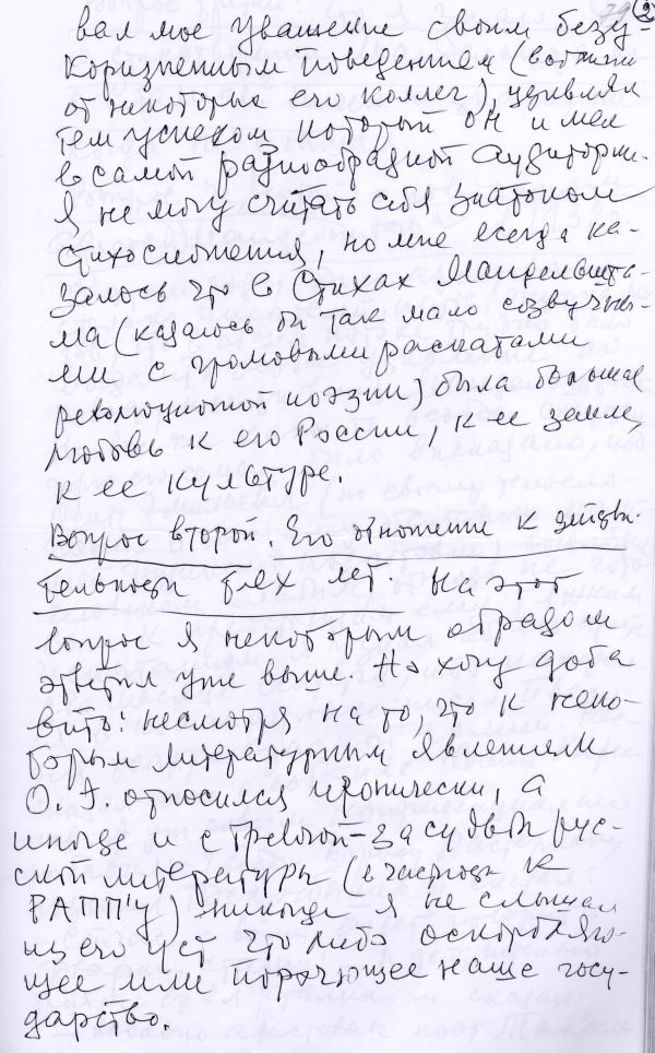 3) О поэте Мандельштаме. Он был недавно арестован и выслан. До ареста он приходил со своей женой ко мне и высказывал свои опасения на сей предмет в связи с тем, что он подрался (!) с А. Толстым, которому нанес «символический удар» за то, что тот несправедливо якобы решил его дело, когда другой писатель побил его жену. Я говорил с Аграновым, но он мне ничего конкретного не сказал. Теперь я получаю отчаянные телеграммы от жены М., что он психически расстроен, пытался выброситься из окна и т. д. Моя оценка О. Мандельштама: он - первоклассный поэт, но абсолютно несовременен; он - безусловно не совсем нормален; он чувствует себя затравленным и т. д. Т. к. ко мне всё время апеллируют, а я не знаю, что он и в чем он «наблудил», то я решил тебе написать и об этом. Прости за длинное письмо. Привет.